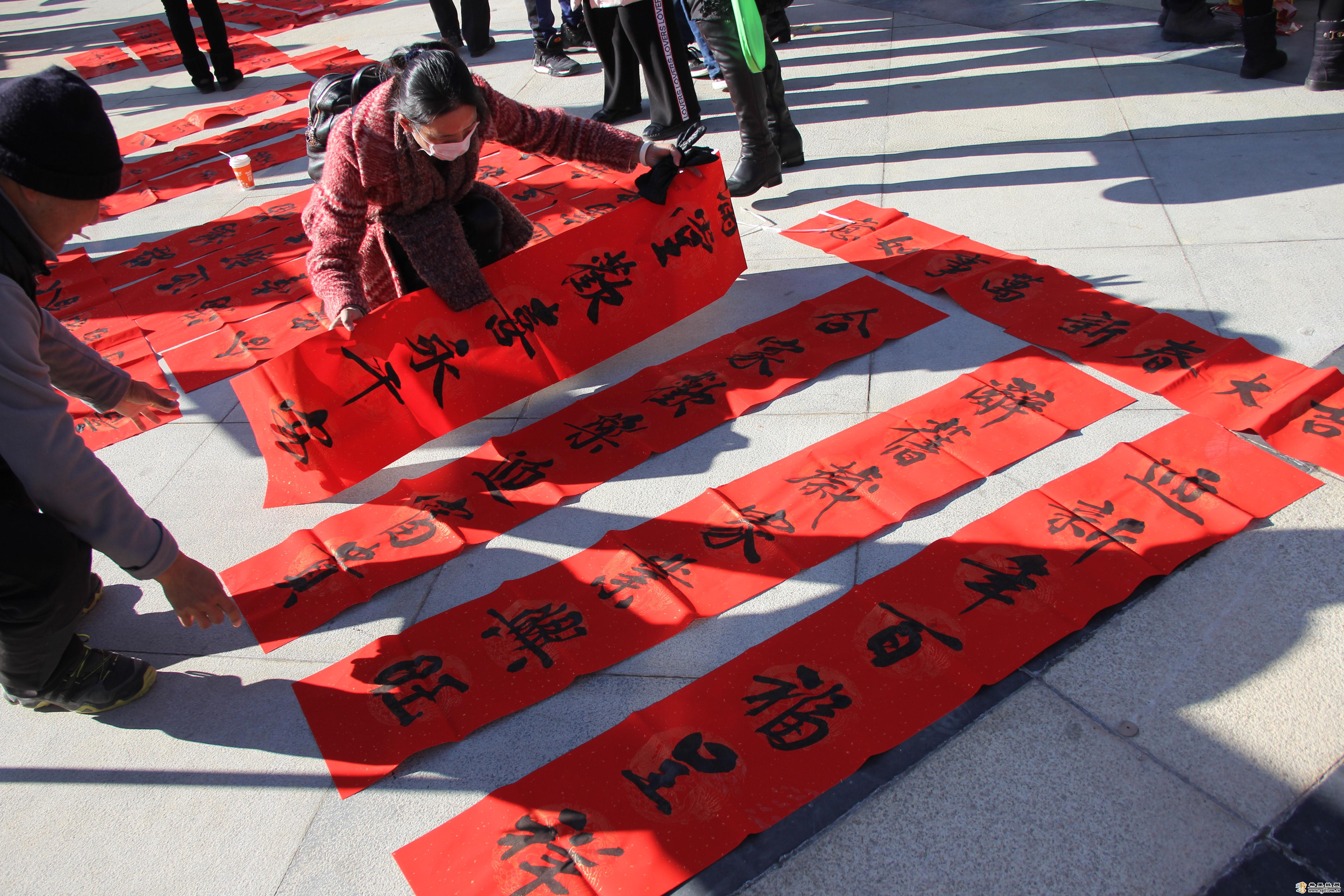2019年1月1日,香格里拉市红太阳广场上人头攒动,墨香四溢,新年穿城跑结束后大家并没有早早散去,目光被一副副春联和专注挥笔的书法家吸引。迪庆州文化馆“红色文艺轻骑兵小分队在行动、‘不忘初心、牢记使命’文艺进万家2019年迎春系列文化惠民”活动在这里开展,为前来观看的市民现场免费写春联、送农家历。