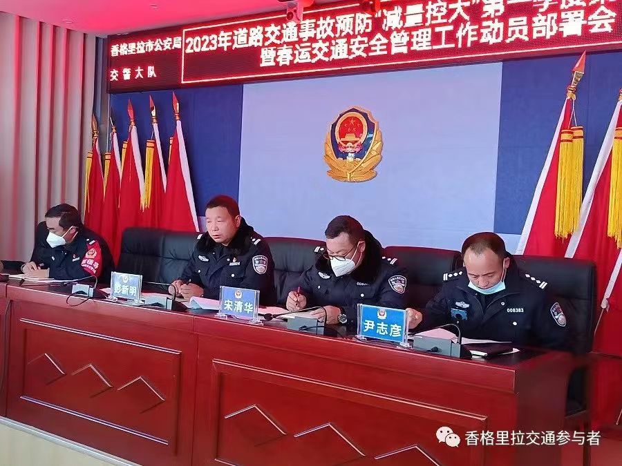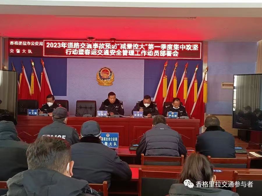 为认真贯彻落实省厅交警总队“12.30”全省公安机关2023年道路交通事故预防“减量控大”第一季度集中攻坚行动动员部署会议精神及迪庆州公安局交警支队召开全州公安机关2023年事故预防“减量控大”第一季度集中攻坚暨春运交通安保工作动员部署会议精神,确保全市道路交通安全形势总体平稳,1月5日上午9时,香格里拉市公安局交警大队召开2023年事故预防“减量控大”第一季度集中攻坚暨春运交通安保工作动员部署会。