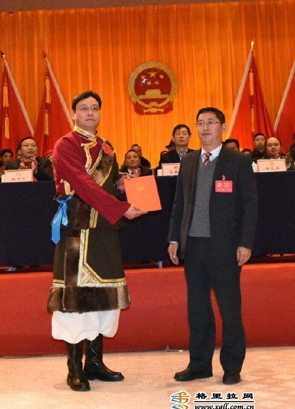 香格里拉市人大常委会主任胡志祥为陈群颁发当选证书。