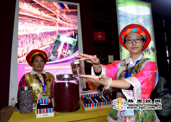 参展的迪庆香格里拉金珂生物资源开发有限公司工作人员正在展示该公司种植的藏红花。