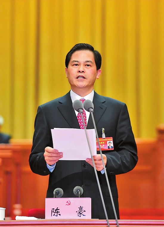 陈豪在会上发表讲话。他说,这次大会描绘了发展蓝图、完成了选举任务、展示了良好会风,从思想上、政治上、组织上,为云南今后一个时期的发展奠定了坚实基础,提供了坚强保证。这是一次高举旗帜、维护核心,凝心聚力、团结鼓劲,聚焦跨越、共谋发展,发扬民主、风清气正,承前启后、继往开来的大会,集中表明了全省干部群众在以习近平同志为核心的党中央坚强领导下,沿着中国特色社会主义道路奋勇前进的坚定信念和坚强决心,将团结动员全省4700万各族人民,向“两个一百年”的伟大目标迈进,为实现中华民族伟大复兴中国梦谱写绚丽多彩的云南篇章。