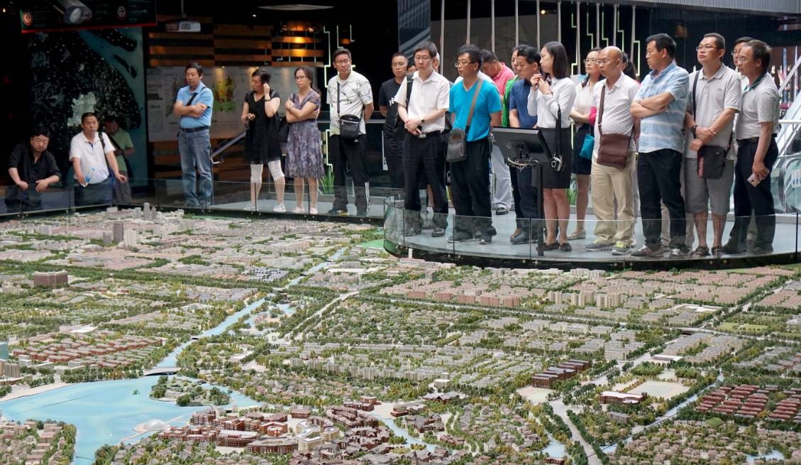 培训班学员在松江新城规划模型展示厅聆听讲解员讲解。