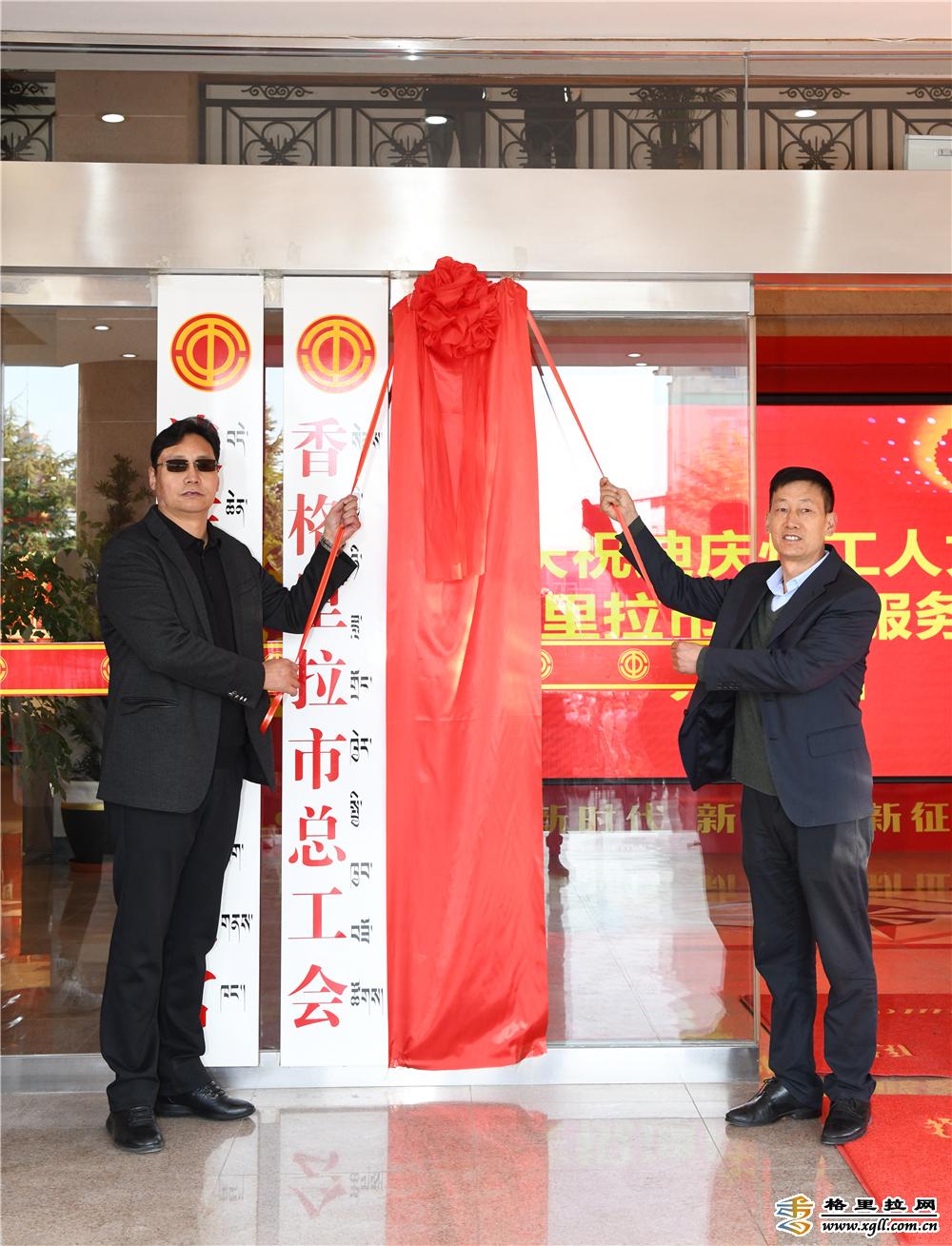 余胜祥、陈群为香格里拉市职工服务中心揭牌。