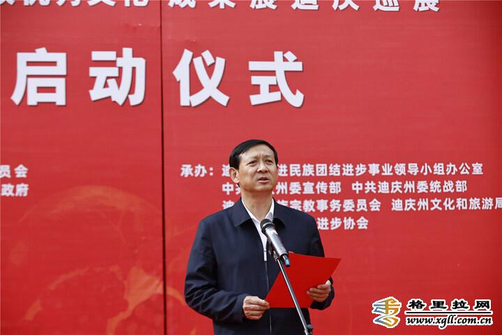 州委副书记彭山在致辞中说,迪庆作为多民族聚居、多宗教共存、多文化交融的民族自治州,民族团结进步始终是全州经济社会发展的坚强基石,是我们做好一切工作的根本前提,是全州各族群众矢志不渝守护的生命线。党的十八大以来,全州各族群众紧密团结在以习近平同志为核心的党中央周围,高举习近平新时代中国特色社会主义思想伟大旗帜,深入学习贯彻中央民族工作会议精神,以习近平总书记关于加强和改进民族工作重要思想为根本遵循,大力推动铸牢中华民族共同体意识各项工作,谱写了新时代民族团结进步事业的迪庆华章。今年9月1日起,新修订的《云南省迪庆藏族自治州民族团结进步条例》正式颁布施行,全州各级各部门要以民族团结进步月为契机,加大对民族法规政策学习宣传,为推动全州民族事务治理体系和治理能力现代化奠定基础。要以云南民族优秀文化成果展迪庆巡展为载体,进一步丰富民族团结进步月活动,深入开展民族团结进步教育,促进全州各民族交往交流交融,积极构筑中华民族共有精神家园,奋力建设好团结富裕文明和谐美丽平安的社会主义现代化新时代新迪庆。