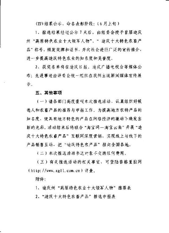 凡是在迪庆州依法设立、从事高原特色农牧业生产的企业法人均可参加领军人物的推选;凡属迪庆境内生产的农副特产或初加工品,具有迪庆区域的独特性或唯一性、有较好的知名度,具有特色、优质、营养和重要价值,发展前景较好的农畜产品,都可以积极申报参评“迪庆十大特色农畜产品”。具体申报参评条件附后。
