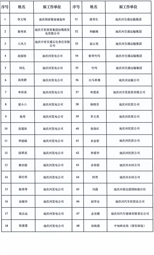 根据《迪庆藏族自治州人民政府办公室关于生活困难企业退休人员帮扶工作实施方案的通知》(迪政办发〔2017〕104号)文件精神和工作要求,经生活困难企业退休人员根据自身具体困难情况,向职能部门提出书面申请,职能部门对申报事项进行初审,州生活困难企业退休人员帮扶领导小组办公室对资料进行复核,领导小组联席会议研究决定:李文明等99名人员拟认定为2023年度生活困难企业退休人员。现予以公示,公示期为7天(2024年1月3日-1月9日)。