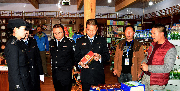 4月20日下午,香格里拉市旅游警察及旅游部门工作人员正在独克宗古城一旅游商店巡查。