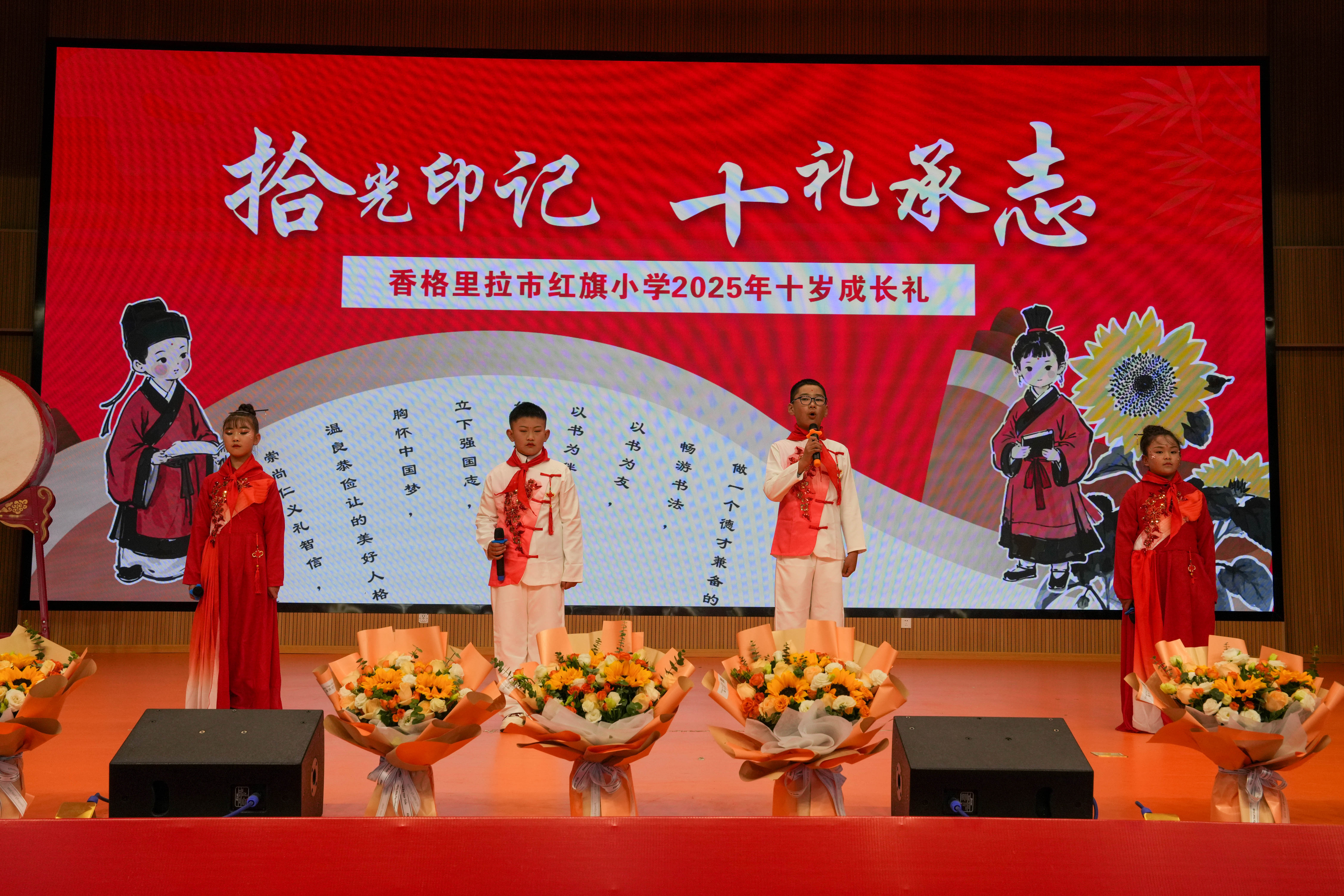 5月6日下午,香格里拉市红旗小学风雨馆内举行了以“拾光印记·十礼承志”为主题的十岁成长仪式。该校四年级全体师生及家长齐聚一堂,通过中华传统礼仪与现代教育融合的形式,为雪域高原的少年们镌刻下独特的成长印记。