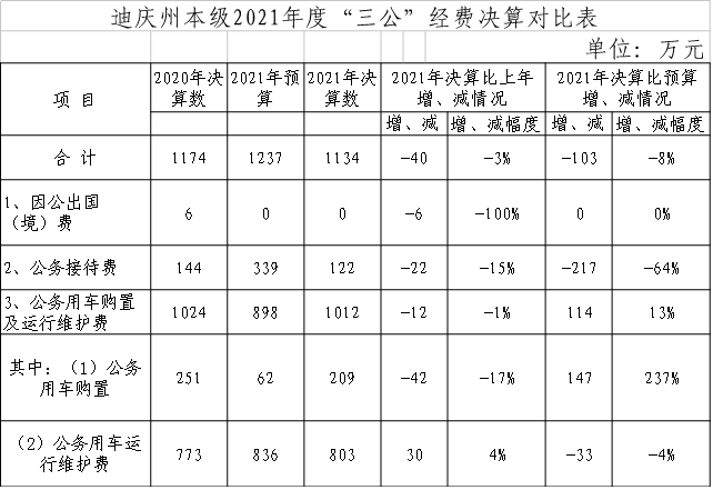 三、2021年使用州本级财政拨款安排“三公”经费的预算部门均纳入统计范围。迪庆州州本级各部门“三公”经费,由各部门在其部门门户网站上与部门决算一同公开。