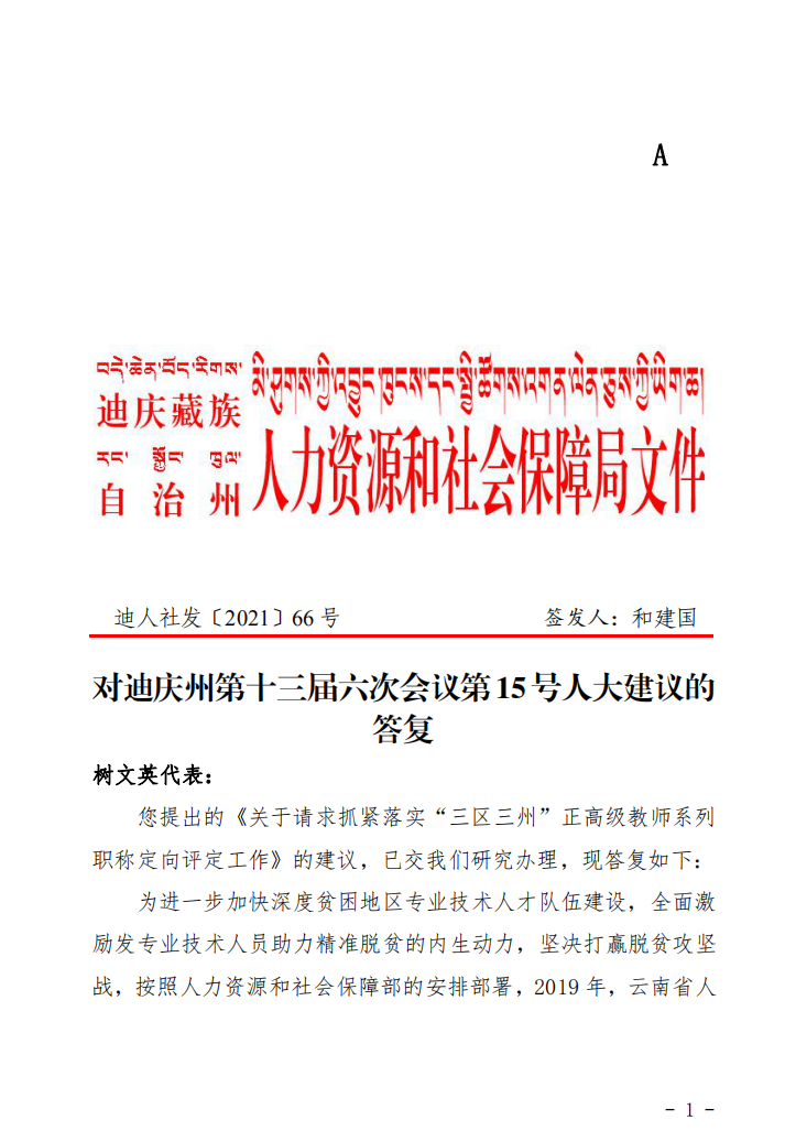 对迪庆州第十三届六次会议第15号人大建议的答复