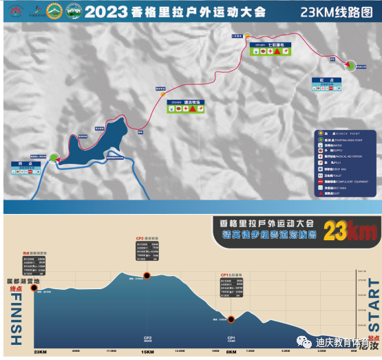 距离:20公里爬 升:390M 下降:1150M露营徒步组年龄在18岁以上60岁以下可报名参加;十、精英徒步组赛事概况1.赛事名称:2023年香格里拉户外大会徒步精英赛2.赛事时间:2023年5月20日3.赛事起点:尼汝村村委会4.赛事终点:普达措属都湖5.赛事线路(男女个人赛):距离:23公里爬 升:1462M 下降:617M赛道路线:尼汝村村委会广场(起点)-七彩瀑布-德吉牧场-普达措属都湖停车广场(终点)(精英徒步组线路图)