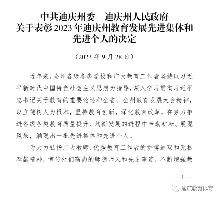 中共迪庆州委 迪庆州人民政府关于表彰2023年迪庆州教育发展先进集体和先进个人的决定