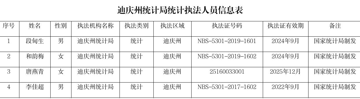 迪庆州统计局统计执法(行政执法)人员信息公示