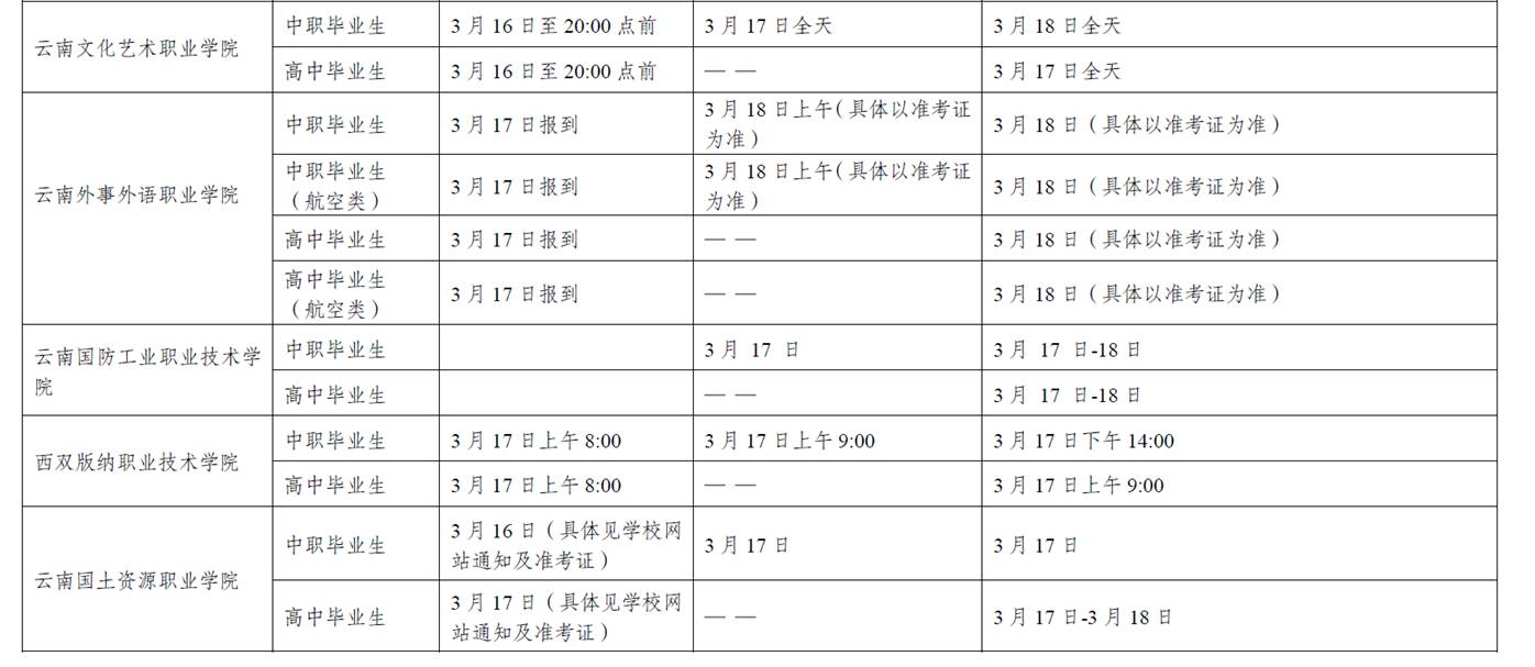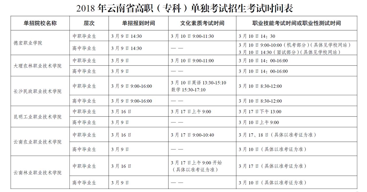 2018年云南省高职(专科)单独考试招生考试时间表