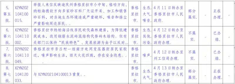 截止2021年4月20日,云南省迎接中央生态环境保护督察工作领导小组边督边改组交办中央第八生态环境保护督察组(以下简称“督察组”)涉及迪庆州群众举报投诉生态环境问题共14件(来电5件、来信9件),涉及香格里拉市7件、维西县2件、州级部门5件。
