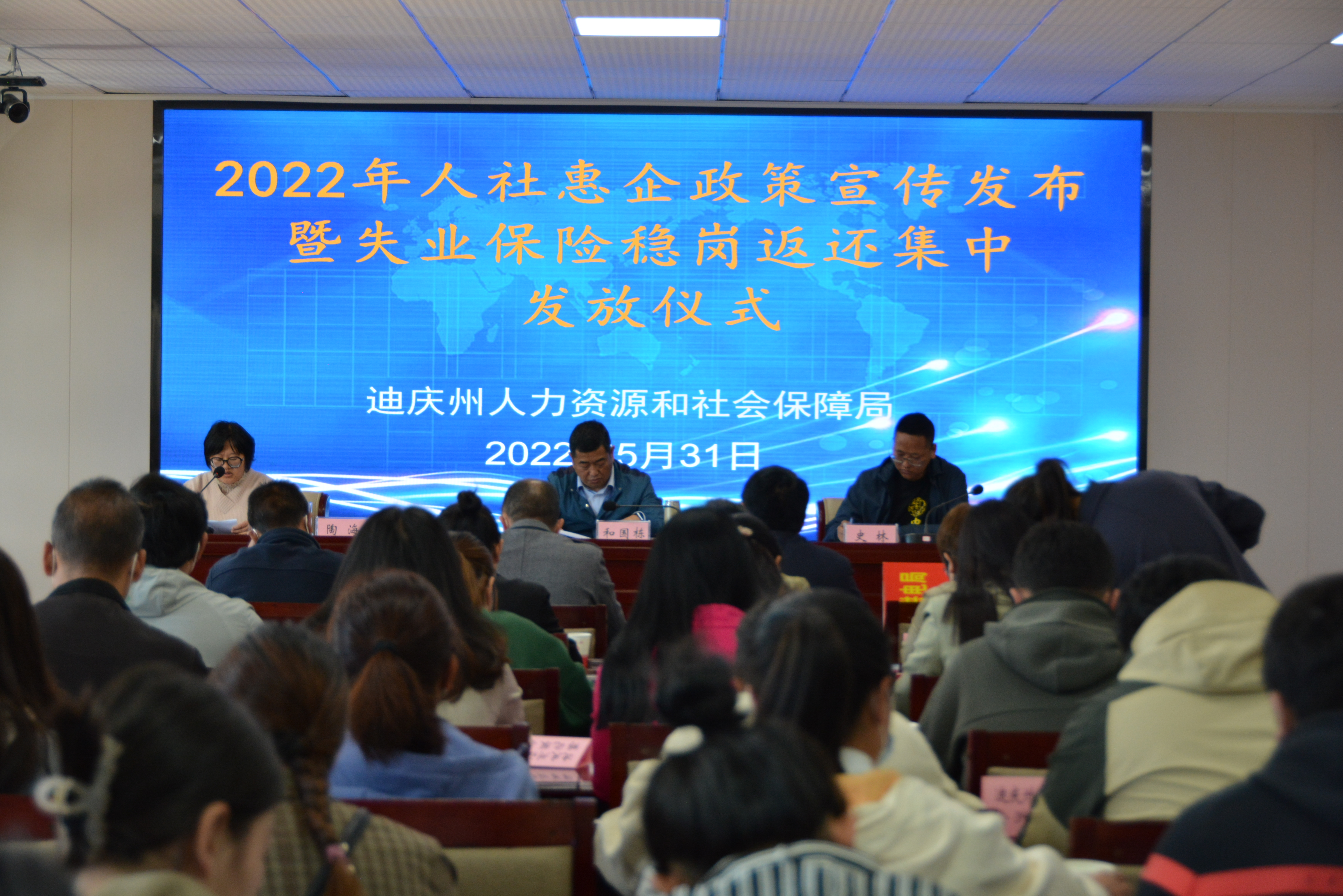 为认真贯彻落实党中央、国务院和省委、省政府关于助企纾困的决策部署,提高人社惠企政策的知晓度,持续推动优化营商环境工作落实,最大限度发挥失业保险稳岗返还稳岗扩就业的政策效应,2022年5月31日,在迪庆州人社局5楼会议室举行人社惠企政策宣传发布暨失业保险稳岗返还集中发放仪式,邀请迪庆州本级70余户代表企业参加。会上,向首批符合条件的125家参保企业集中发放稳岗返还资金339.24万元。州人社局党组成员、就业局局长和国栋出席发放仪式并讲话。
