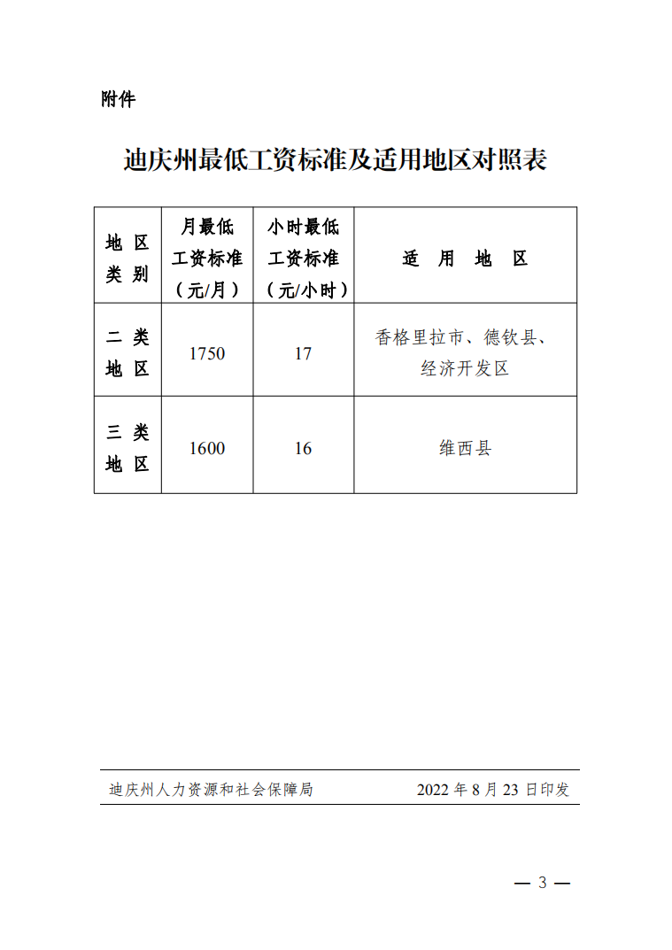 迪庆州人力资源和社会保障局关于调整最低工资标准的通知