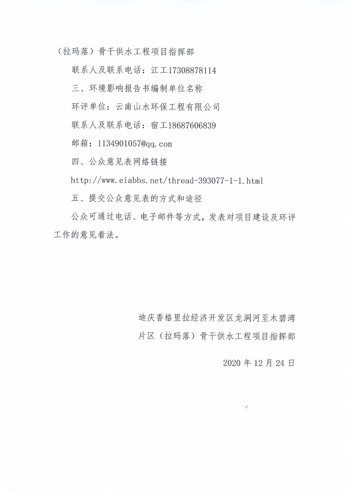 迪庆香格里拉经济开发区龙洞河至木碧湾片区(拉玛落)骨干供水工程环境影响评价公众参与第一次信息发布