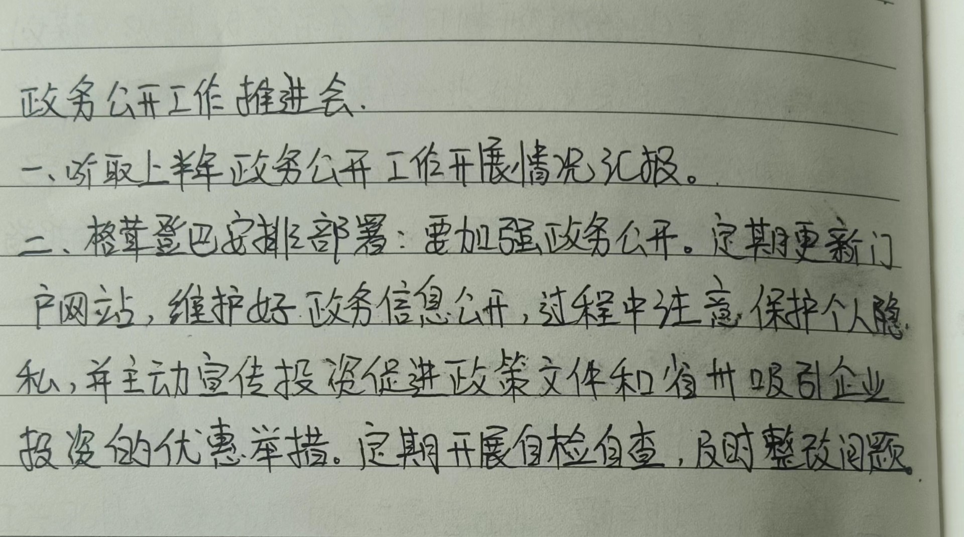 主要负责同志在会上安排部署下一阶段的政务公开工作,强调要加强政务公开。一是定期更新门户网站,维护好政务信息公开,过程中注意保护个人隐私;二是主动宣传投资促进政策文件和省、州吸引企业投资的优惠举措;三是定期开展自检自查,及时整改问题。
