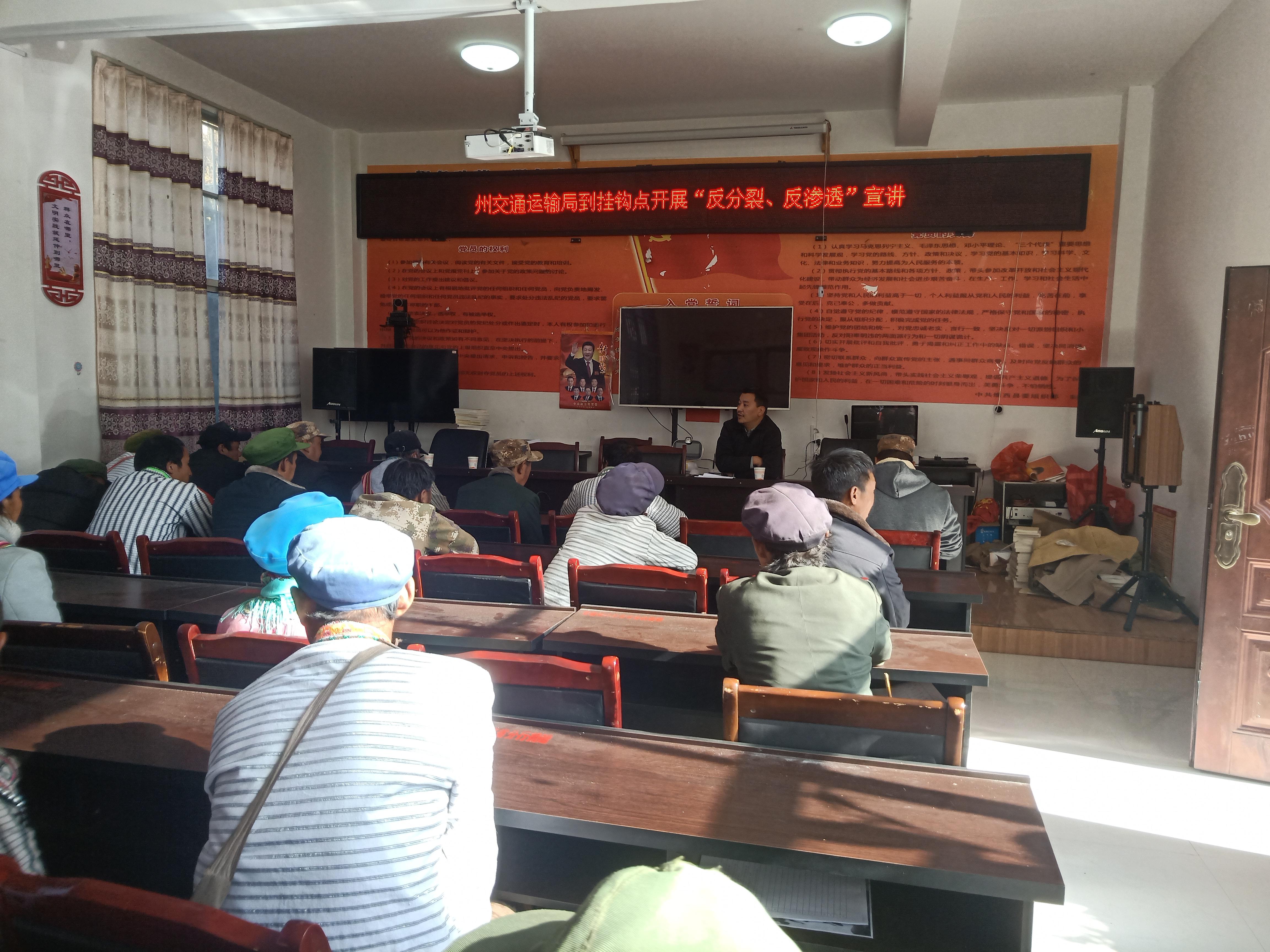 反分裂反渗透工作开展以来,迪庆藏族自治州交通运输系统认真组织,周密谋划,多措并举,全面传达学习贯彻相关精神,并将学习反分裂反渗透精神作为当前和今后一个时期的中心任务。近日,我局在开展扶贫点维西县中路乡腊八山村开展“反分裂、反渗透”宣讲活动。
