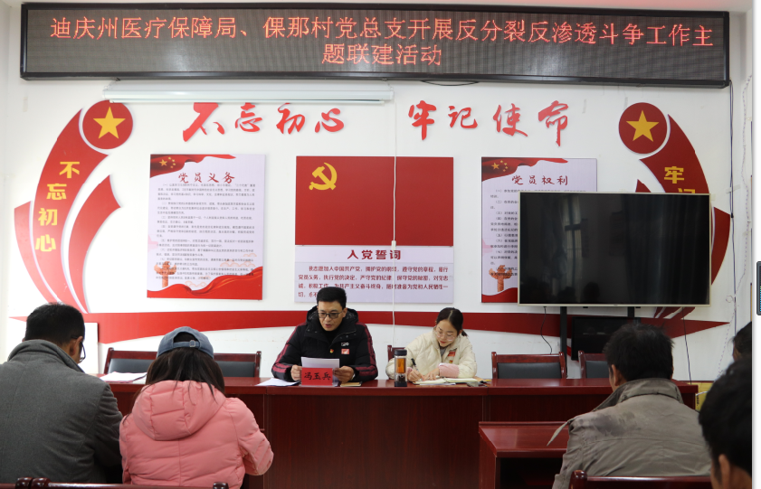 讲授专题党课。为进一步学习领会习近平新时代中国特色社会主义思想,认真学习领会“七座会”精神特别是习近平总书记重要讲话精神,深化对总书记西藏工作重要论述、治边稳藏战略思想和新时代党的治藏方略的理解把握,扎实开展好反分裂斗争,旗帜鲜明、针锋相对、主动治理、强基固本,州医保局党组成员、副局长冯玉兵同志为维西县叶枝镇倮那村党员干部讲授“开展好反分裂斗争、维护社会长治久安”专题党课。