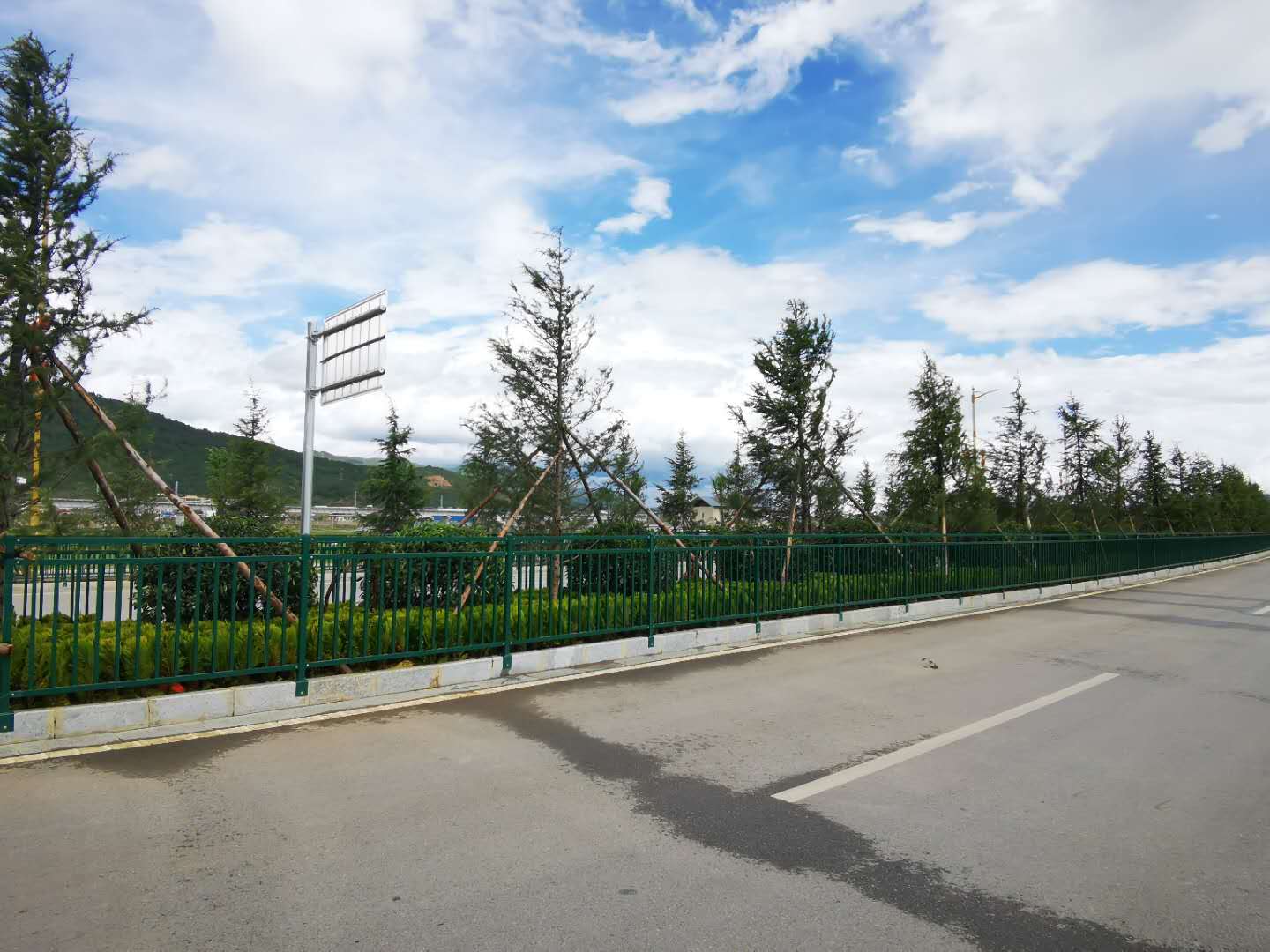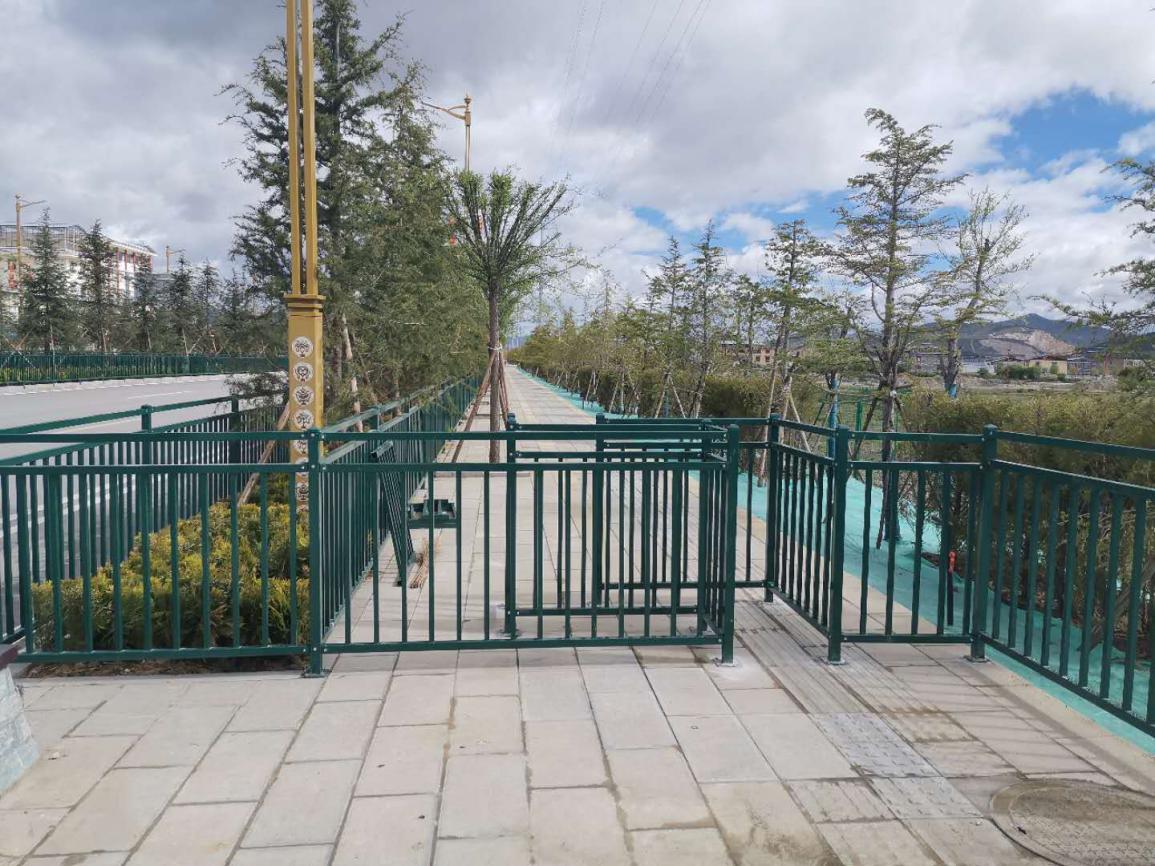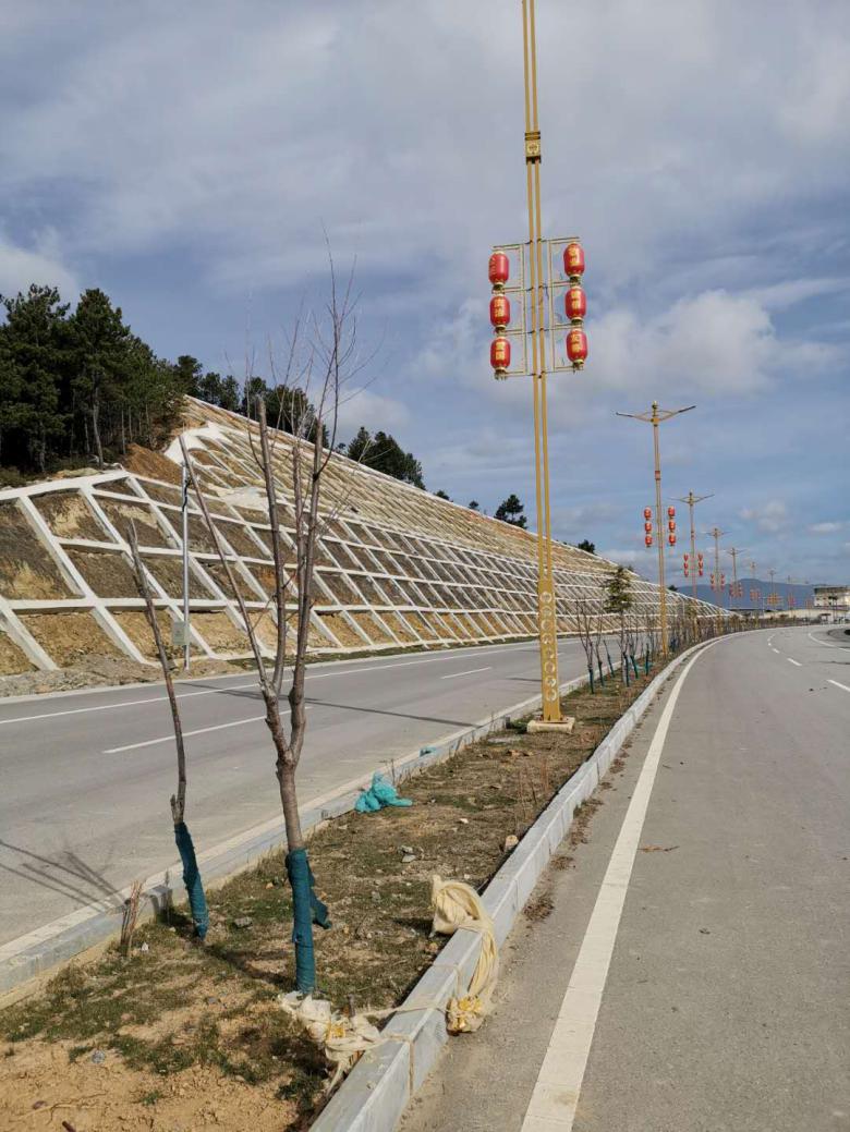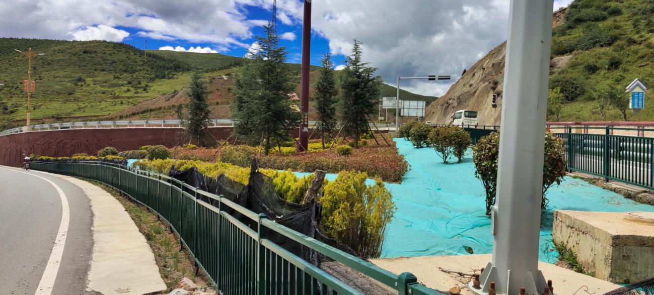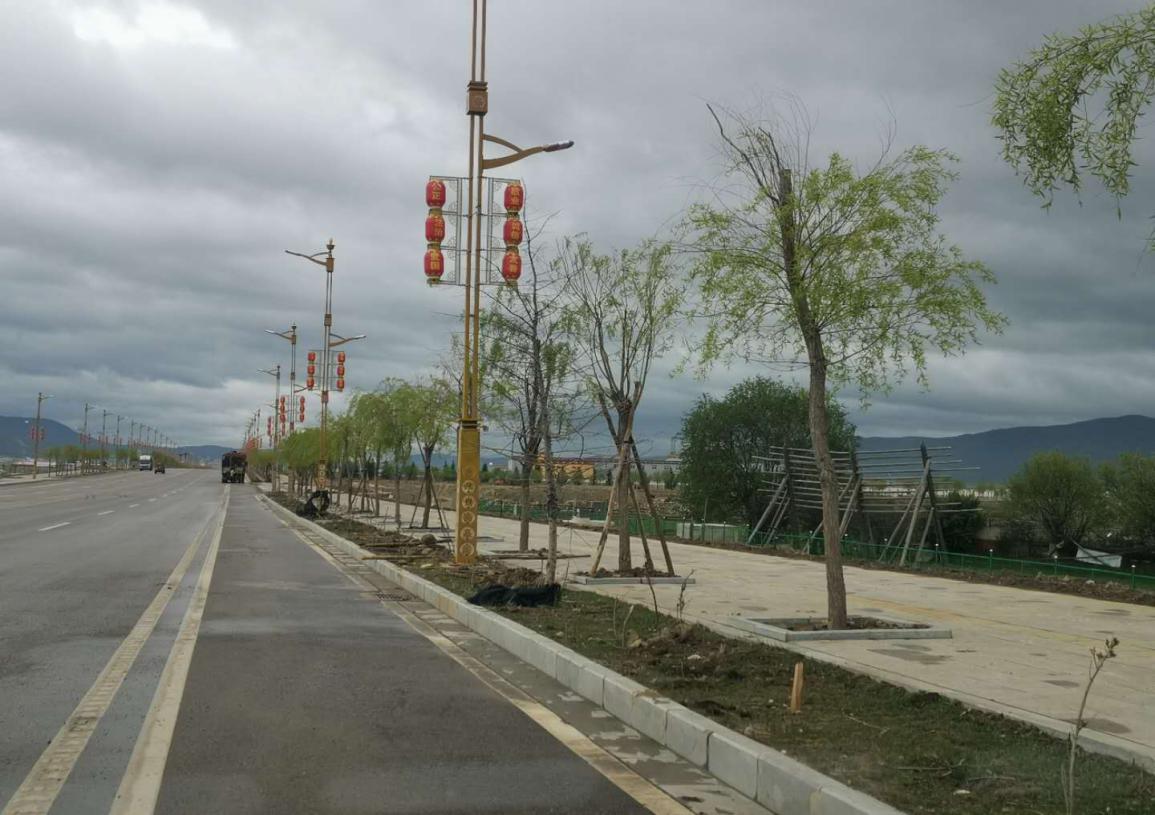 工程规划设计坚持生态、文明、环保理念,整条道路通过本次绿化提升改造,使城市道路景观达到整齐划一的绿化效果。植物生态采用多层次地被、灌木及乔木分层设计,充分采种后期低维护和适应本地高寒气候的绿植(如雪松、白柳、洒金柏等),并配种高秆月季、樱花等进行点缀;植物浇灌养护采用预埋给水管道,平地人工浇灌与护坡面山自动喷灌相结合;设置特色景观小品、休憩场所及亮化设施,衬托体现本地民族文化特色;硬景铺装尽可能采用本地透气、透水性良好的彩色混凝土。