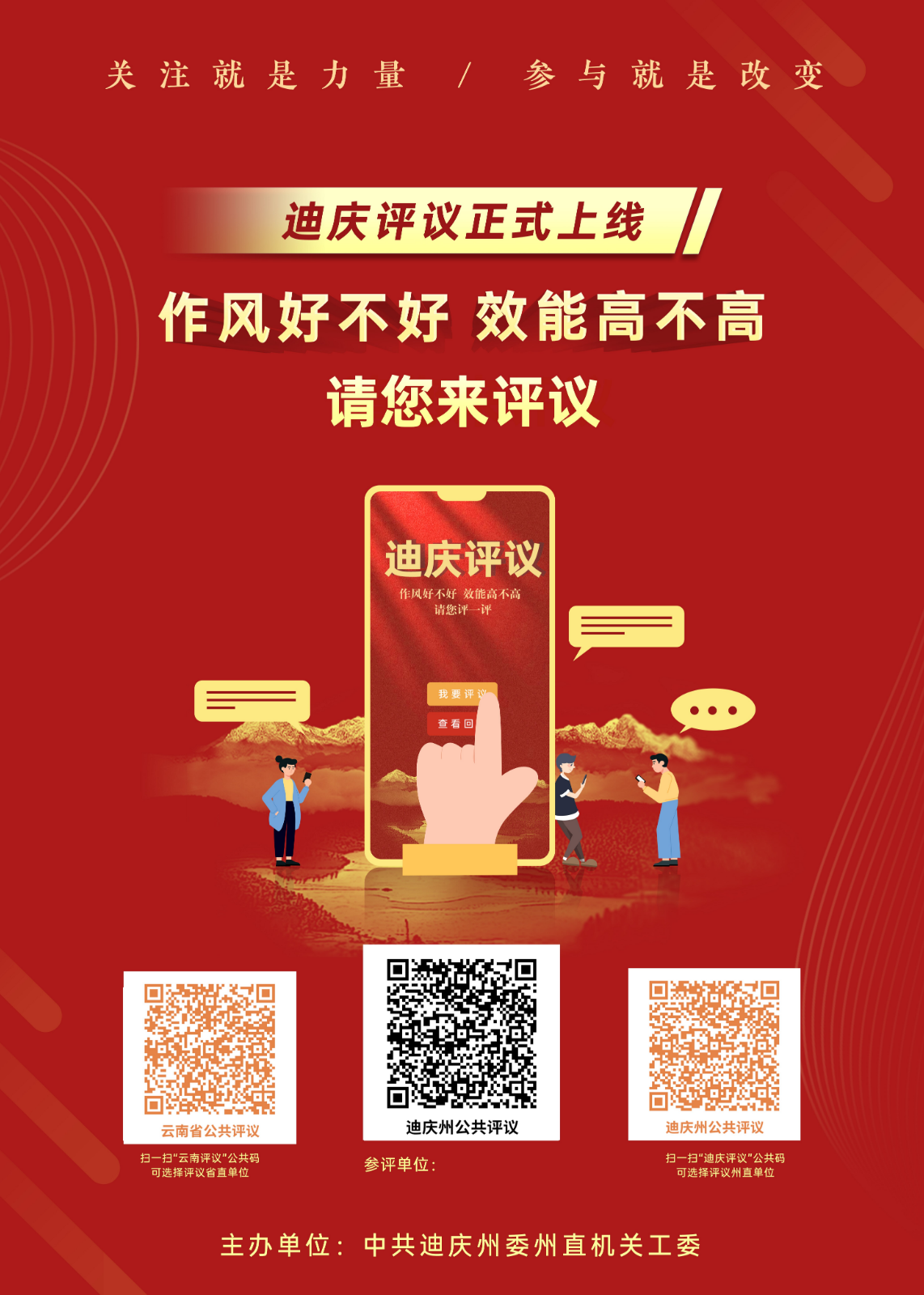 为全面贯彻党的二十大关于全面从严治党战略部署、习近平总书记考察云南重要讲话、重要指示批示精神和省委、州委推进作风革命效能革命要求,紧扣机关党建“围绕中心、建设队伍、服务群众”这个根本任务,牢固树立“今天再晚也是早,明天再早也是晚”的效率意识,在“服务企业、服务群众、服务基层”中强化责任担当、提高工作标准、转变工作作风,迪庆州州直机关现面向社会各界公开“迪庆评议”微信扫码及时评价渠道,通过评议工作倒逼机制,主动接受群众监督,进一步提升服务质量,优化营商环境,让数据多跑路、群众少跑腿,着力打造市场化、法制化、国际化营商环境。