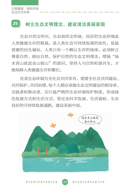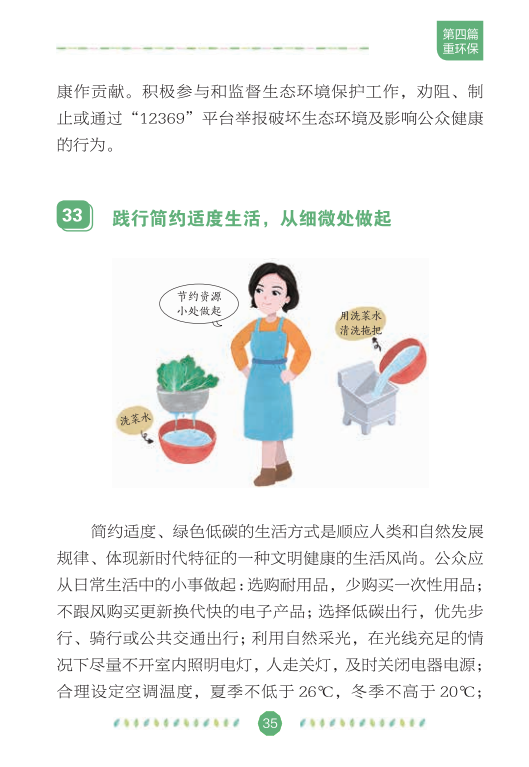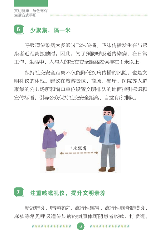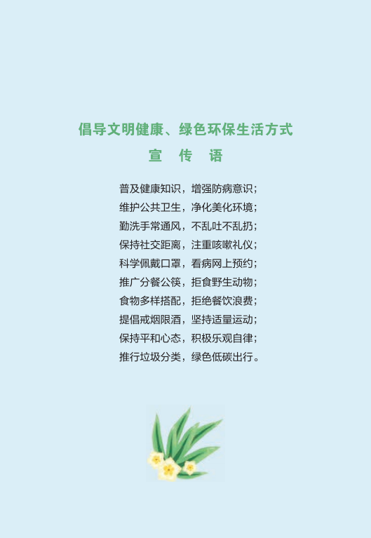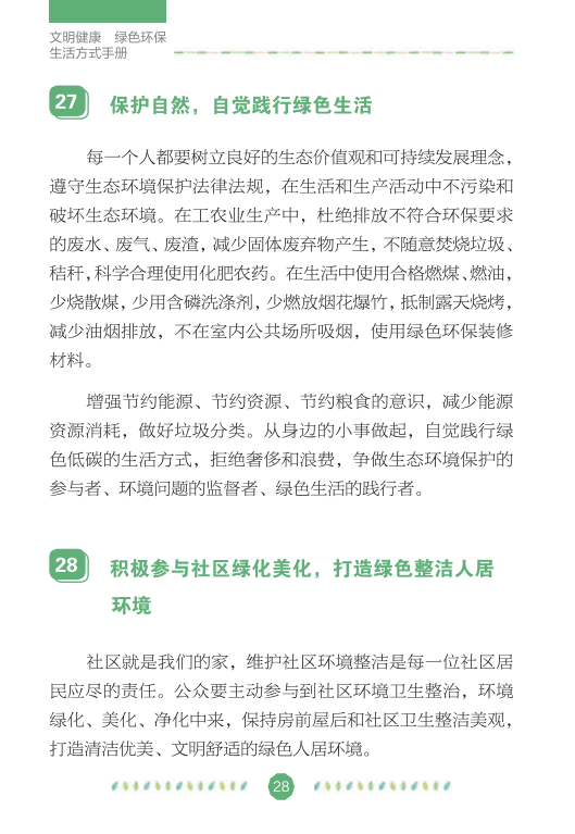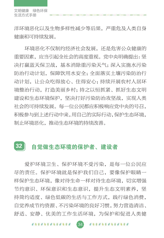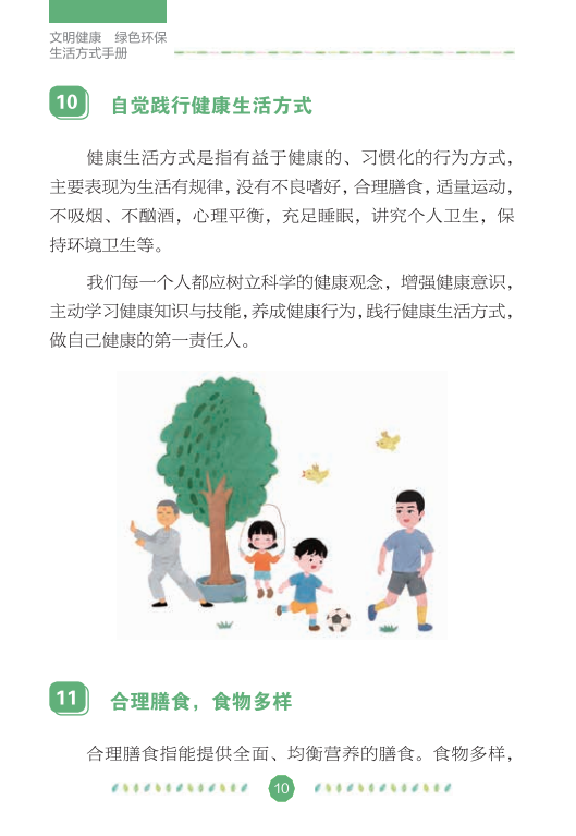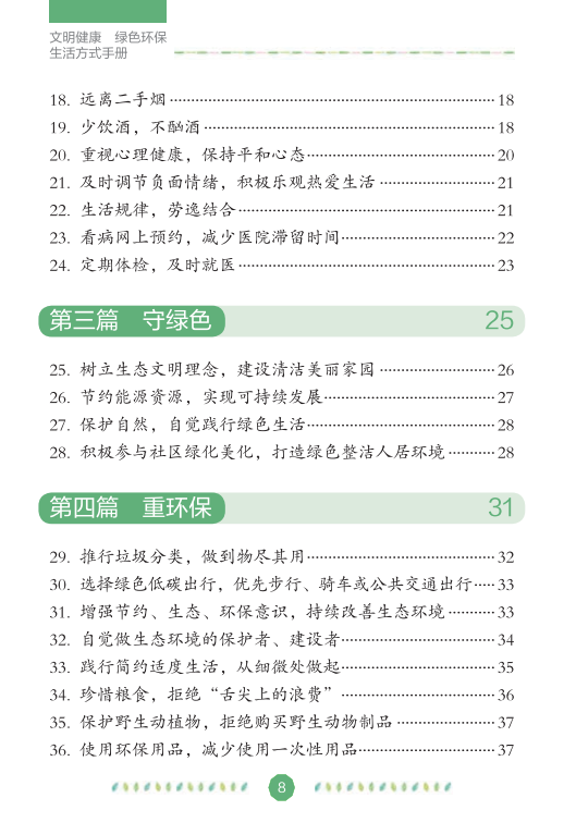 今年4月是第35个爱国卫生月。在全国爱卫办、中央文明办、健康中国行动推进办的指导下,中国健康教育中心组织专家编写了《文明健康绿色环保生活方式手册》,分别从讲文明、铸健康、守绿色、重环保4个角度,向公众介绍如何在日常生活、工作和学习中积极践行文明健康、绿色环保的生活方式,切实增强公众的节约意识、环保意识和生态意识,维护自己和家人的健康,实现可持续发展。
