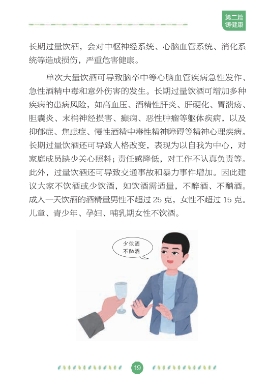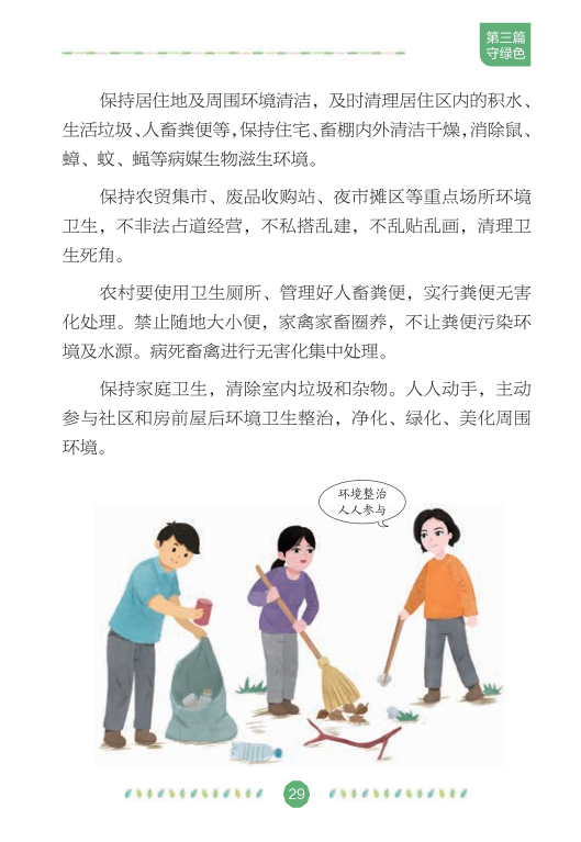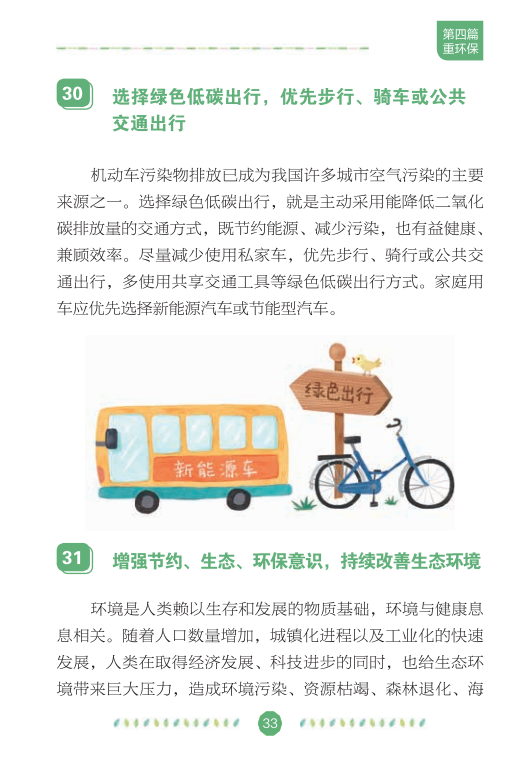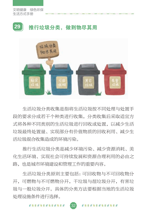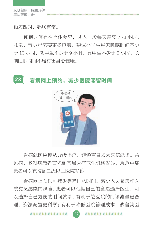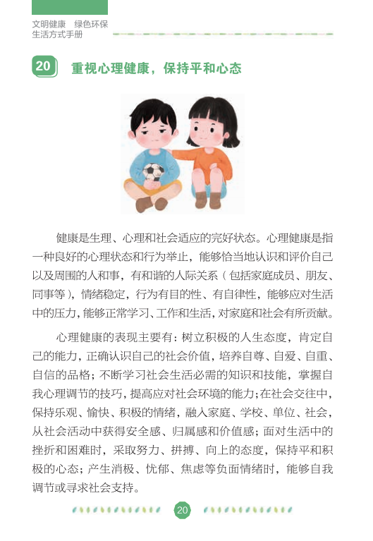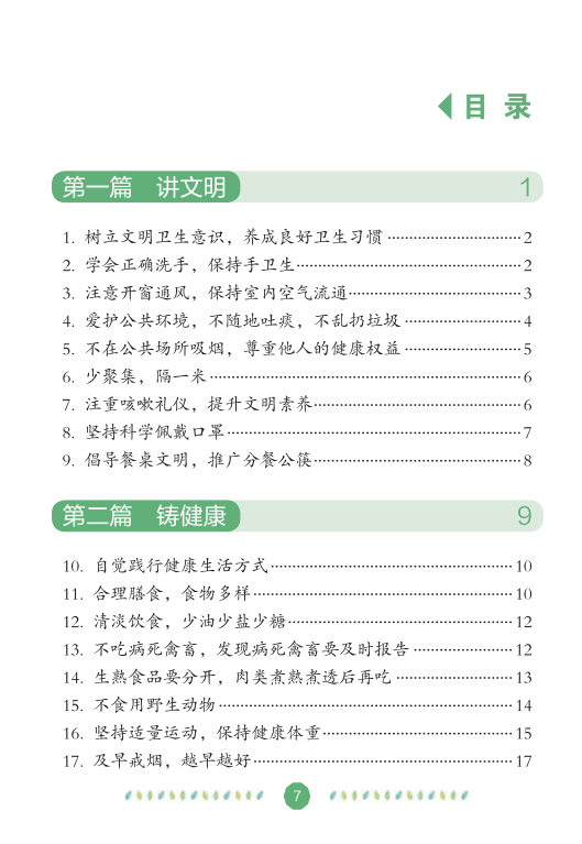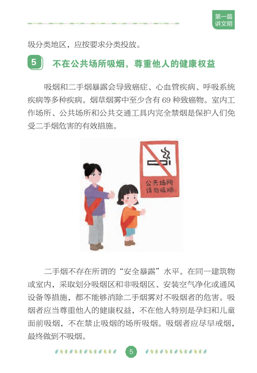 今年4月是第35个爱国卫生月。在全国爱卫办、中央文明办、健康中国行动推进办的指导下,中国健康教育中心组织专家编写了《文明健康绿色环保生活方式手册》,分别从讲文明、铸健康、守绿色、重环保4个角度,向公众介绍如何在日常生活、工作和学习中积极践行文明健康、绿色环保的生活方式,切实增强公众的节约意识、环保意识和生态意识,维护自己和家人的健康,实现可持续发展。