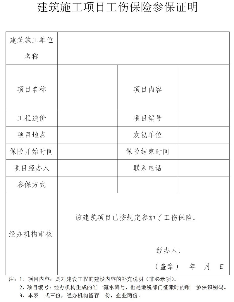 第十六条 工程建设施工企业在申办《建筑业企业安全生产许可证》、《施工许可证》及非煤矿山、危险化学品《安全生产许可证》等有关证照时,应如实提供《建筑施工项目工伤保险参保证明》(见附件)。住房和城乡建设、安监等部门在办理有关证照的核发、变更、延期手续时,应当严格审查工程建设施工企业参加工伤保险情况,查验《建筑企业参加工伤保险参保证明》。未提供《建筑企业参加工伤保险参保证明》的不予办理《建筑业企业安全生产许可证》、《施工许可证》和《安全生产许可证》等有关证件。