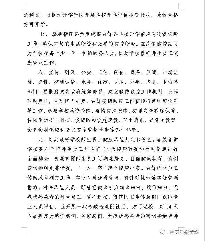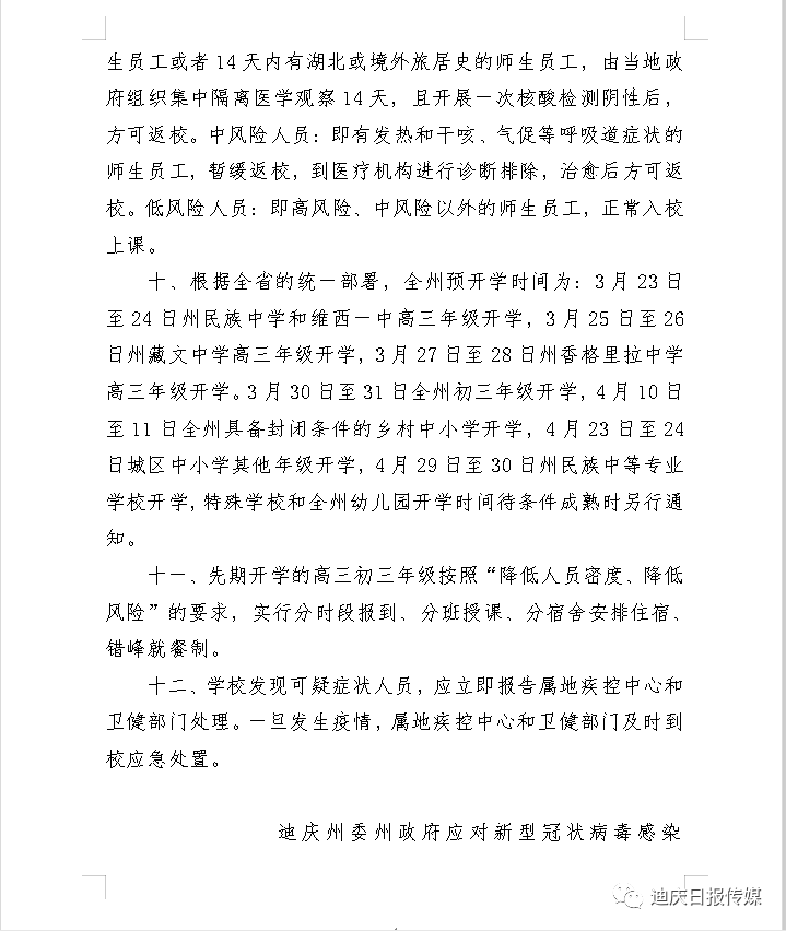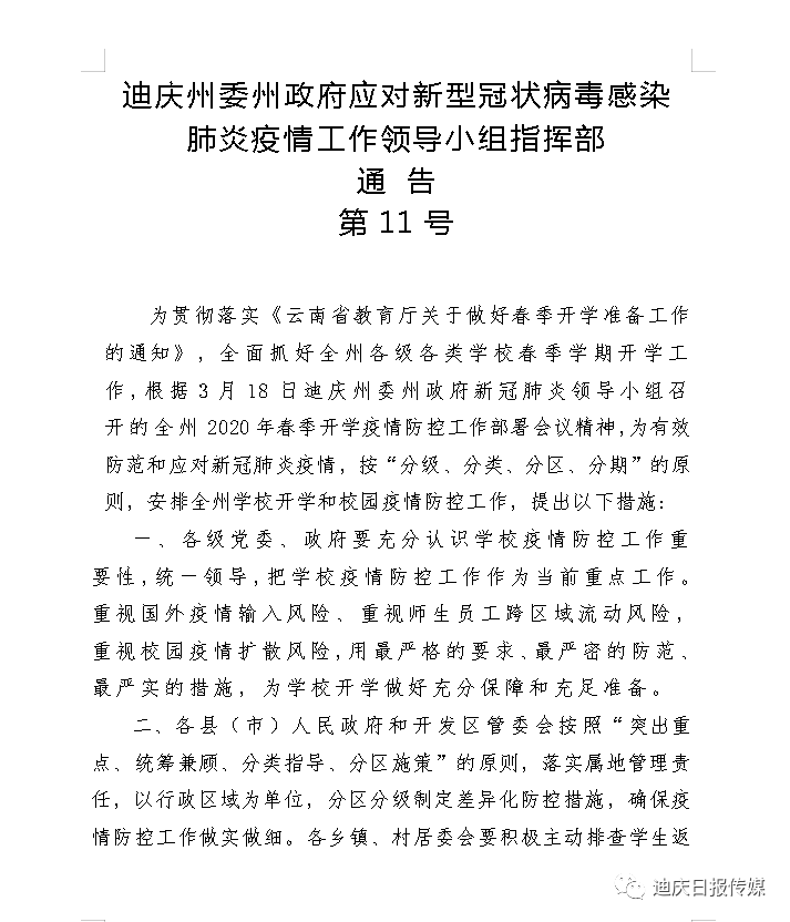 迪庆州发布第11号通告 对全州学校开学和校园疫情防控工作提出措施