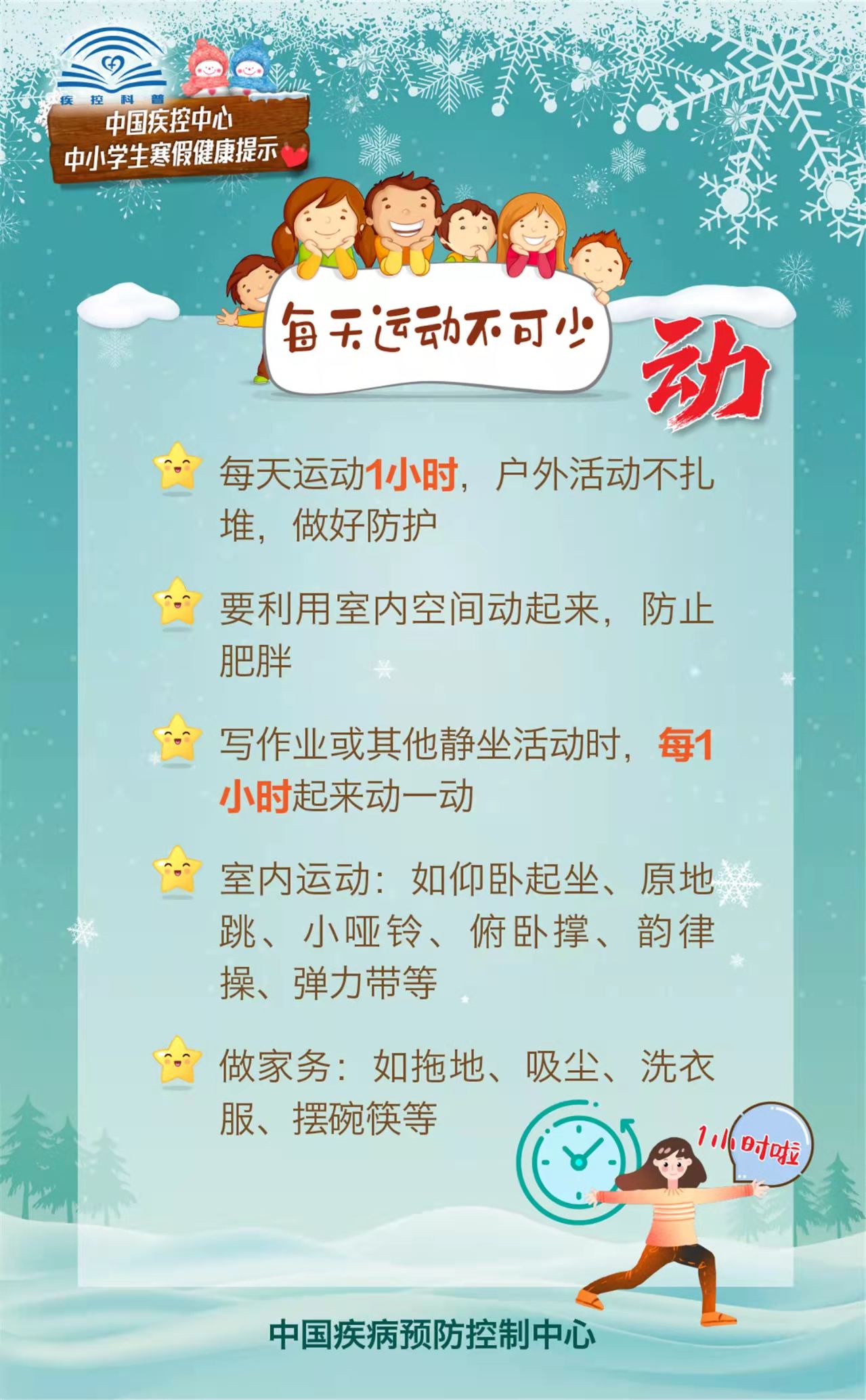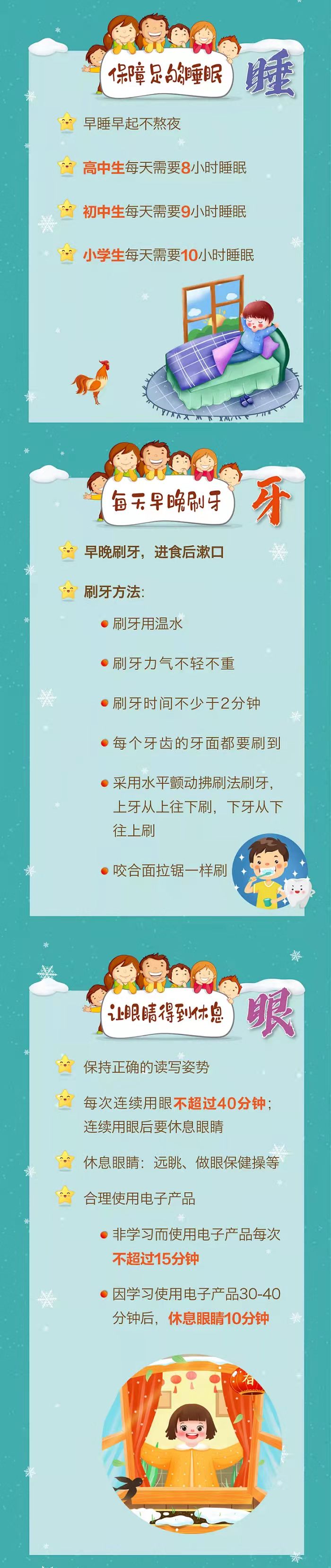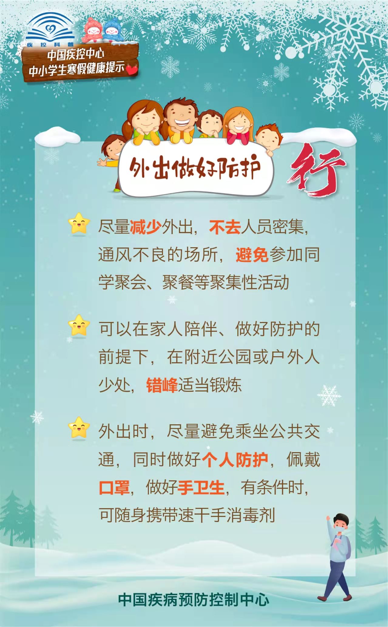 为指导家长们在疫情期间做好中小学生的寒假健康防护,促进中小学生们养成良好的健康生活方式,中国疾控中心围绕学生日常饮食、运动、学习、出行等生活起居,编制了《中小学生寒假健康提示》科普材料。