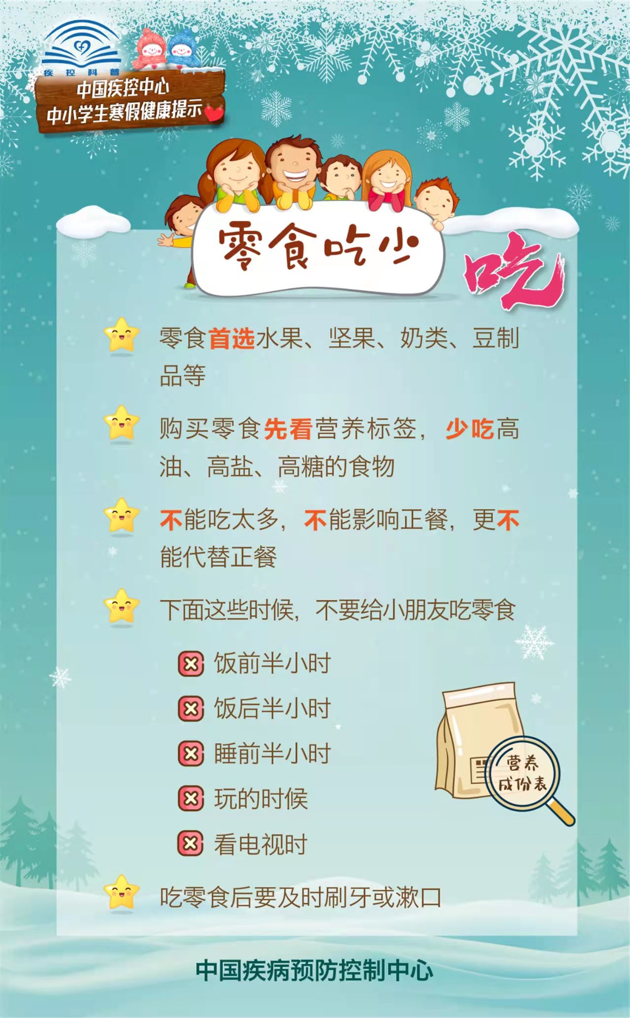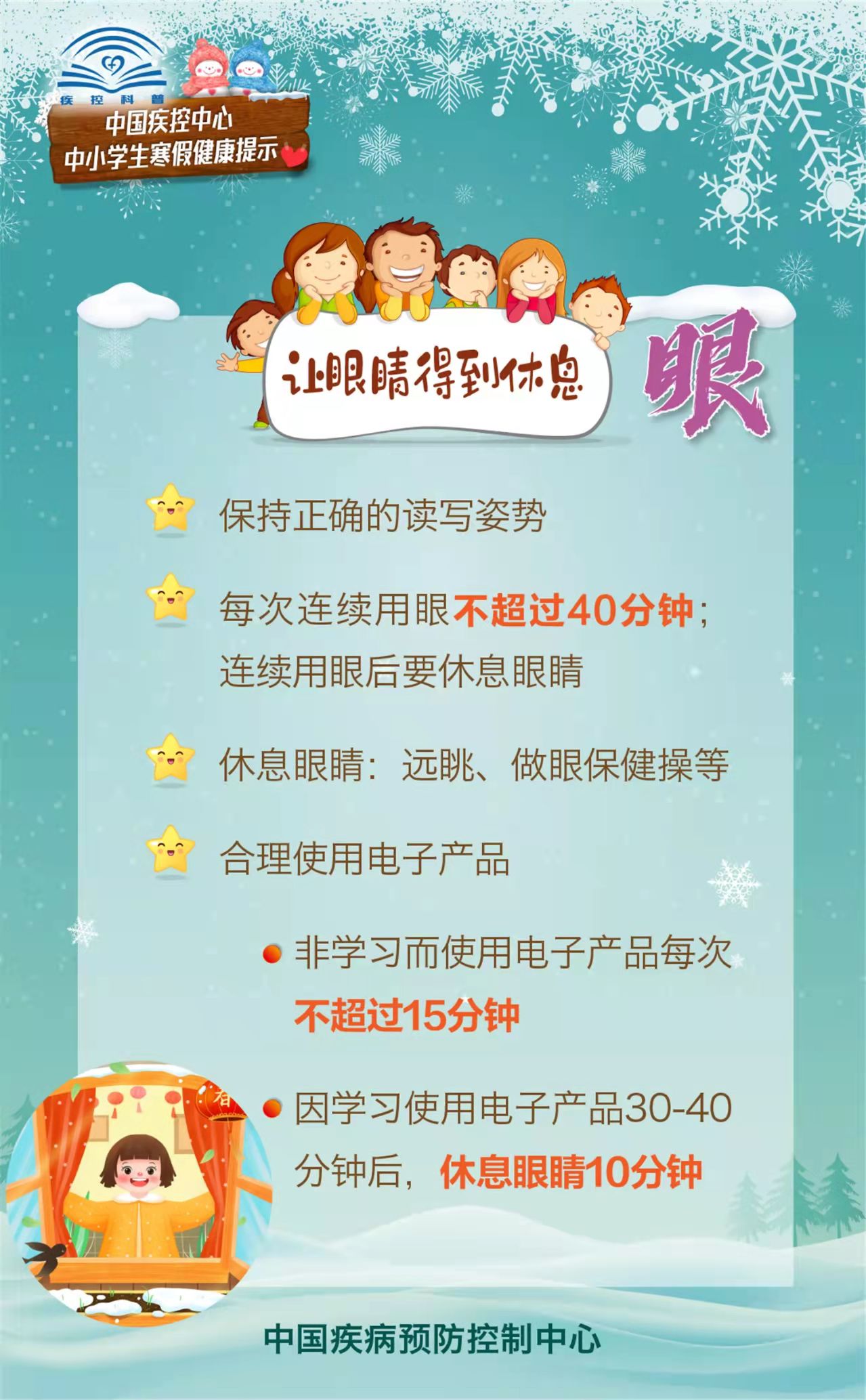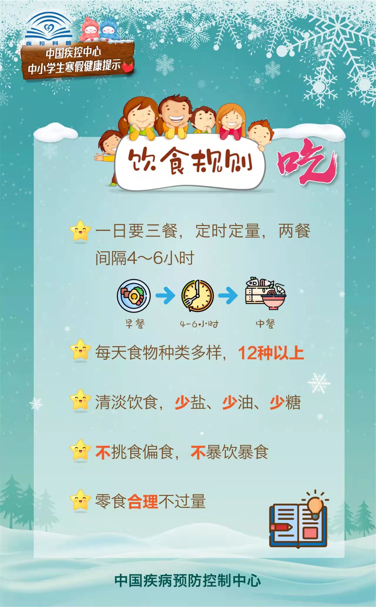 为指导家长们在疫情期间做好中小学生的寒假健康防护,促进中小学生们养成良好的健康生活方式,中国疾控中心围绕学生日常饮食、运动、学习、出行等生活起居,编制了《中小学生寒假健康提示》科普材料。