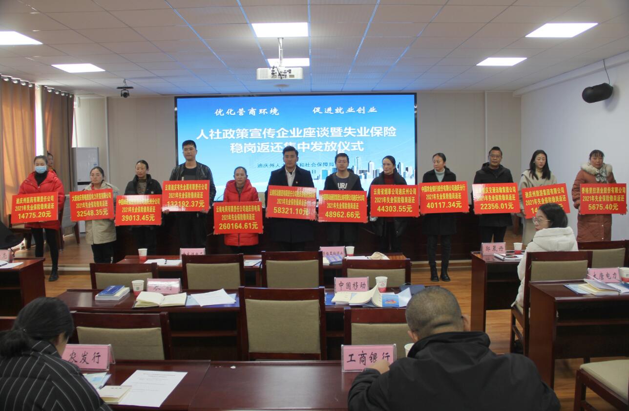 香格里拉网讯(记者 黄晓丽)12月1日,州人社局组织召开人社政策宣传企业座谈暨失业保险稳岗返还集中发放仪式,为12个企业发放稳岗返还资金71.33万元。据悉,与往年不同,今年我州失业保险稳岗返还采取“免申即享”服务,企业无需申请、递交材料,人社部门采取后台大数据比对,核实用人单位享受政策条件后,直接向符合条件的企业精准发放稳岗返还资金,让企业零跑腿享受政策红利。