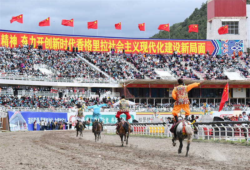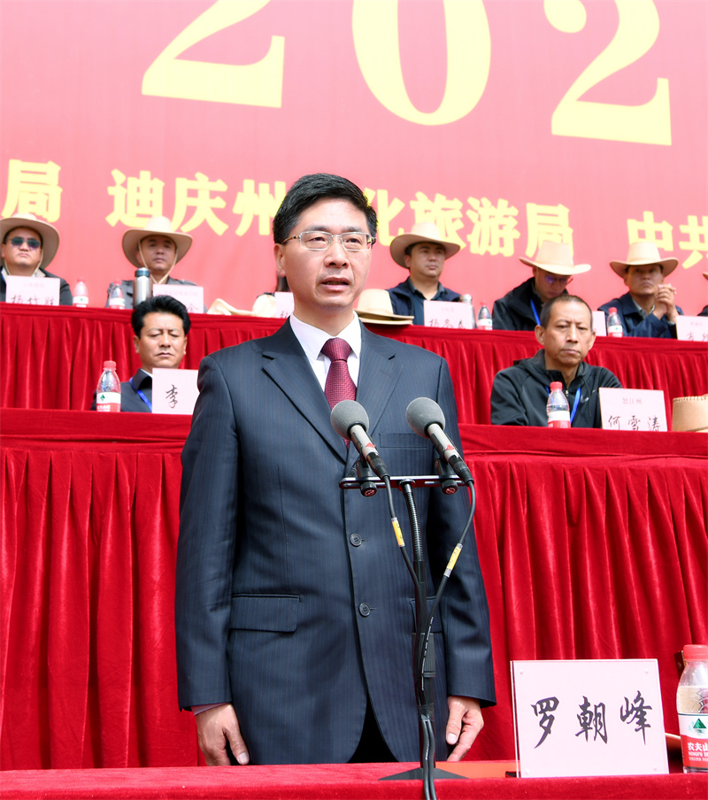 上午10时,活动在万众期待中正式拉开序幕,伴随着礼炮和阵阵马蹄声运动员有序入场。随后,庄严肃穆的旋律响起,全场起立举行升国旗仪式,共唱中华人民共和国国歌。 州委书记罗朝峰宣布迪庆·香格里拉2023年端午赛马节开幕。 州委常委、香格里拉市委书记杨梓江致辞。他说,党的十八大以来,在党中央的亲切关怀下,在省委、省政府和州委、州政府的坚强领导下,香格里拉市坚持推动高质量发展,如期实现脱贫摘帽,进入“高速时代”“5G时代”,即将在全国涉藏州县中率先进入“动车时代”,各项事业取得长足进步,各族群众的获得感、幸福感、安全感明显增强,世界的“香格里拉”正逐步从蓝图走向现实。他表示,举办此次赛马节,是香格里拉市实施“润心工程”文化育人行动,充分挖掘节庆文化资源,唱响主旋律、弘扬正能量、提振精气神,以文化人、以文育人的重要举措。期望通过举办此次活动,有力促进各民族交往交流交融,有力促进“以文塑旅、以旅彰文”取得新成效,有力促进大滇西旅游环线、大香格里拉旅游圈建设取得新进展。 香格里拉市委副书记、市长巨燕冬主持开幕式。 开幕式上,“一足冲天”“马背倒立”“直立献花”“双鹰展翅”等精彩绝伦的马术表演赢得了观众欢呼喝彩。大型文艺演出“飞马拾银话端午”以《马背传颂》《马道归韵》《马踏欢歌》《马踏飞燕》《万马奔腾》五个篇章生动讲述了香格里拉“茶马古道”的历史文化和自古以来群众与马的不解之缘,同时,展现了祖国的发展给边疆少数民族地区带来的翻天覆地的变化和各族群众感党恩、听党话、跟党走,团结奋斗共同描绘新时代的壮美画卷,奏响新征程华美乐章的信心和决心。 “很激动也很幸运能跟香格里拉的群众一起共庆如此盛大的节日,香格里拉是很多人向往的心灵的归宿,今天我在这里真切感受到了香格里拉人民的热情淳朴、民族文化的多元、生态旅游资源的富集,相信在不久的将来它也一定能够成为世界各国游客心中的必游之地。”在现场观看开幕式的北京游客李奇说道。 我州领导苗有发、江楚、陈群、杨学文、费炳强、杨树奇、李涛等及省级有关企业、高校,毗邻州、市、县、区领导等出席开幕式。