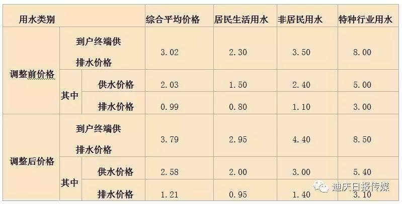 从2017年7月1日用水量起,城市供排水综合平均价格从3.02元/m3(含原水及水资源费0.20元/m3)上调到3.79元/m3(含水资源费0.20元/m3,原水费0.10元/m3)。其中:供水综合平均价格由2.03元/m3(含原水及水资源费0.20元/m3)上调到2.58元/m3(含水资源费0.20元/m3,原水费0.10元/m3);污水处理综合平均价格由0.99元/m3上调到1.21元/m3。分类到户水价如下: