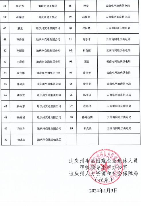 根据《迪庆藏族自治州人民政府办公室关于生活困难企业退休人员帮扶工作实施方案的通知》(迪政办发〔2017〕104号)文件精神和工作要求,经生活困难企业退休人员根据自身具体困难情况,向职能部门提出书面申请,职能部门对申报事项进行初审,州生活困难企业退休人员帮扶领导小组办公室对资料进行复核,领导小组联席会议研究决定:李文明等99名人员拟认定为2023年度生活困难企业退休人员。现予以公示,公示期为7天(2024年1月3日-1月9日)。
