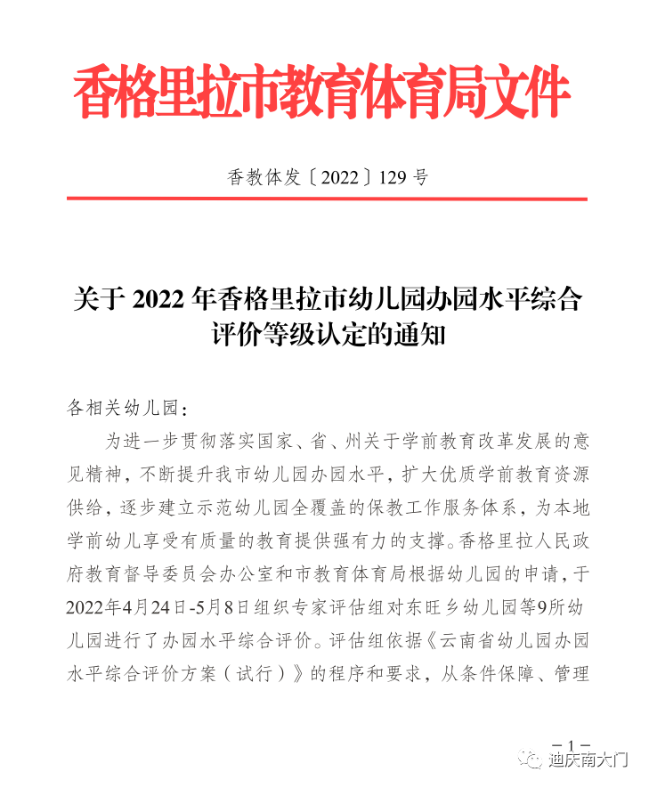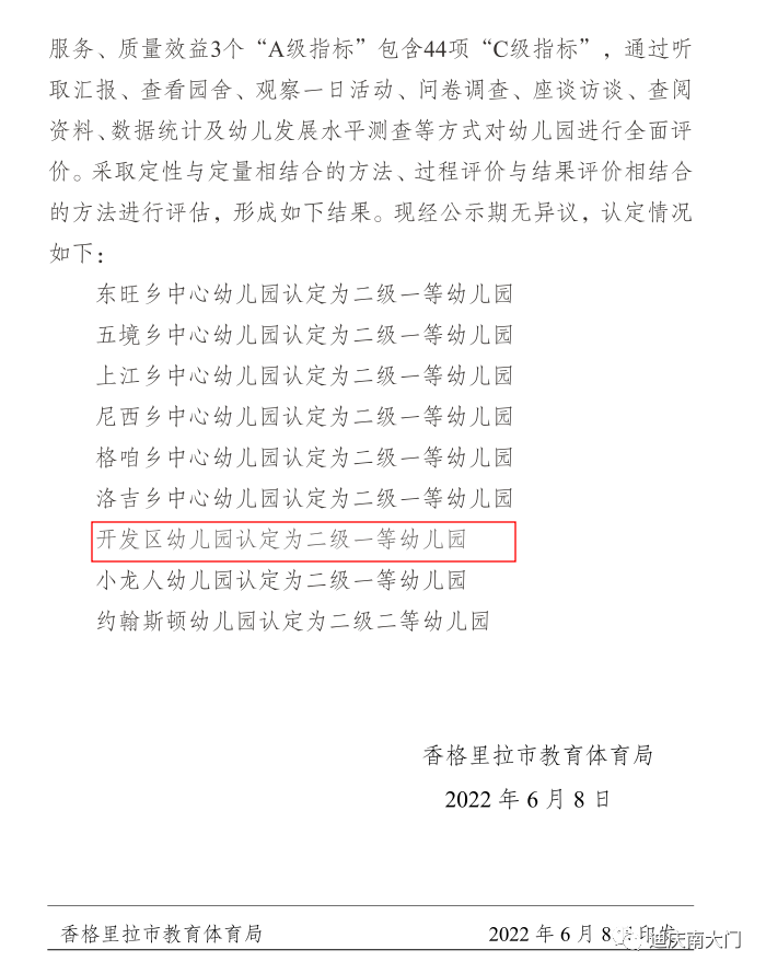 根据云南省幼儿园办园水平综合评价方案,开发区幼儿园对标对表认真梳理、积极投入等级创建工作,在全体教职工不懈的努力下,经过专家组的综合评价,开发区幼儿园达到了云南省“二级一等”幼儿园的标准。