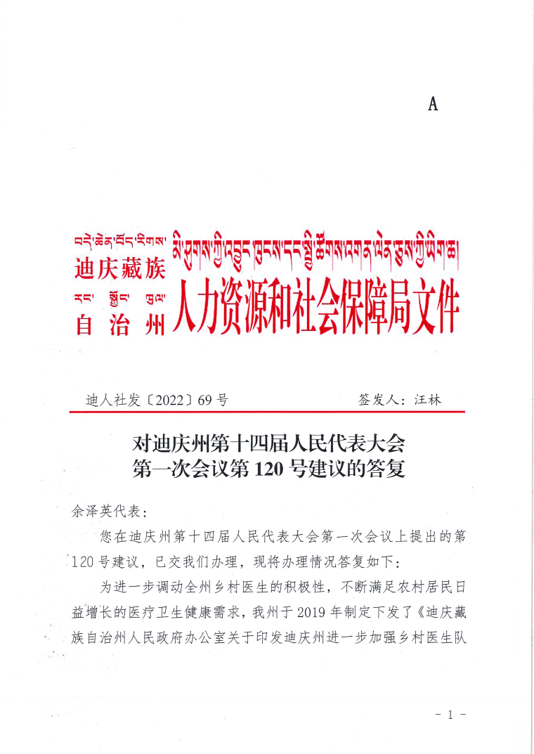 对迪庆州第十四届人民代表大会第一次会议第120号建议的答复
