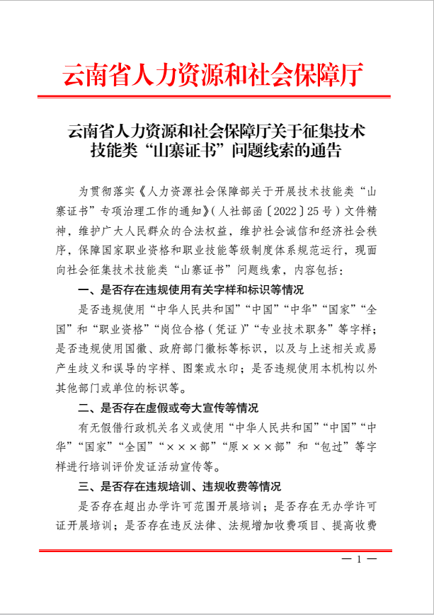 云南省人力资源和社会保障厅关于征集技术技能类“山寨证书”问题线索的通告