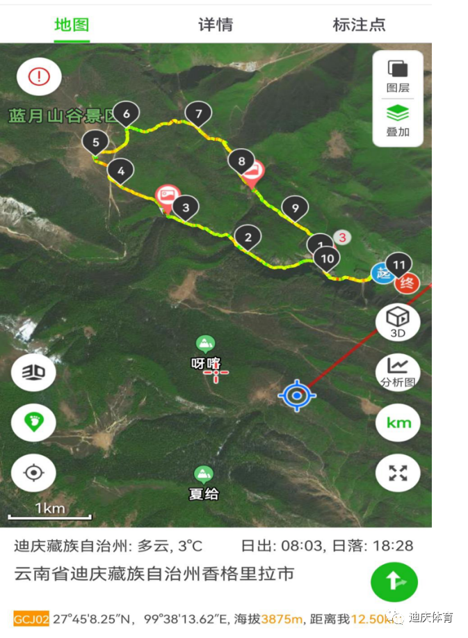 线路总长11.1KM环线,累计爬升524M,最高海拔3785M,最低海拔3338M。