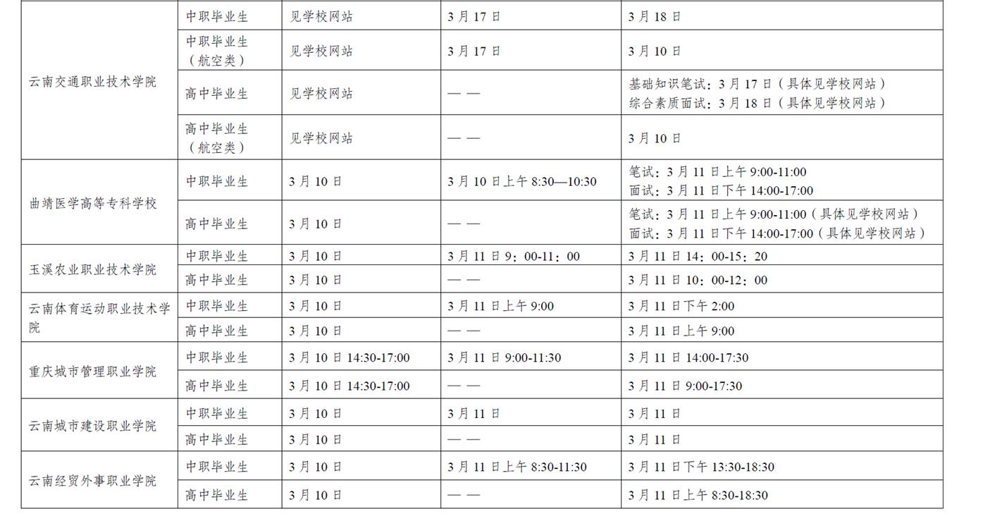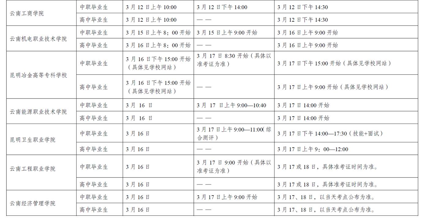 2018年云南省高职(专科)单独考试招生考试时间表