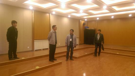 下图为冯金祥局长、蜂志诚副局长、电教室李布主任对远程课程直播厅装修情况进行查看,冯金祥局长同时询问顶面刮腻子粉完成后下一步工作的处理以及对整个远程课程直播厅的容纳人数(大约170人)。