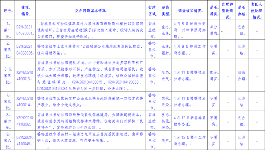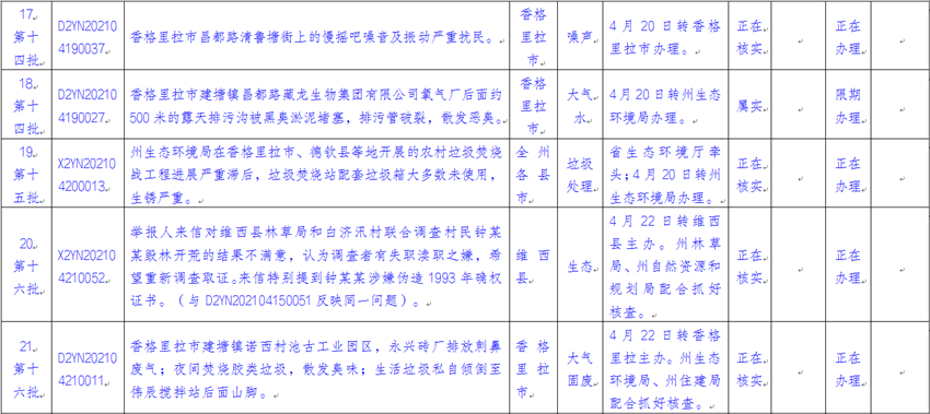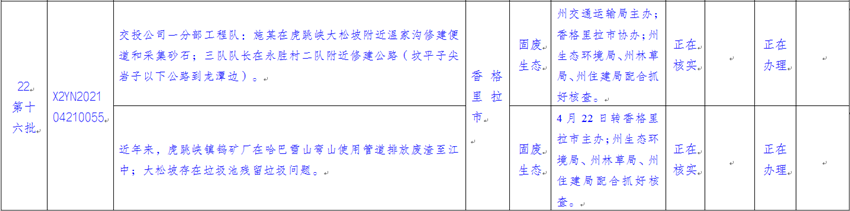 截止2021年4月24日,云南省迎接中央生态环境保护督察工作领导小组边督边改组交办中央第八生态环境保护督察组(以下简称“督察组”)涉及迪庆州群众举报投诉生态环境问题共22件(来电8件、来信14件),涉及香格里拉市12件、维西县3件、州级部门7件。