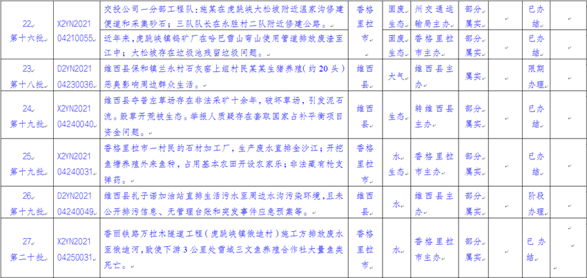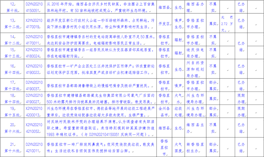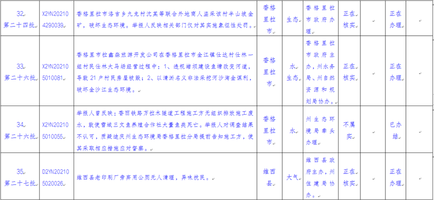 截至2021年5月4日上午,云南省迎接中央生态环境保护督察工作领导小组边督边改组交办中央第八生态环境保护督察组(以下简称“督察组”)涉及迪庆州群众举报投诉生态环境问题共35件(来电12件、来信23件),涉及香格里拉市20件、德钦县1件、维西县7件、州级部门7件。
