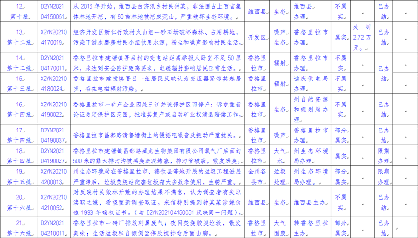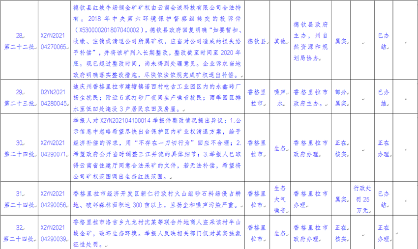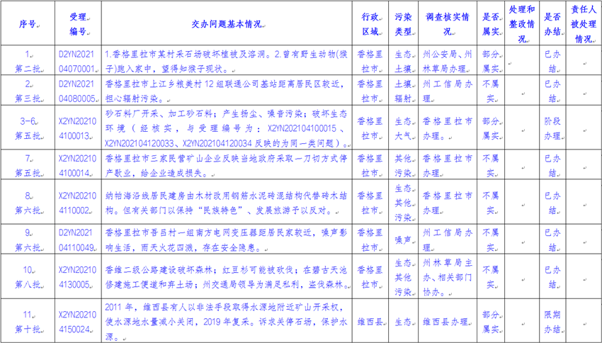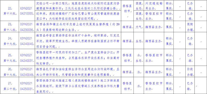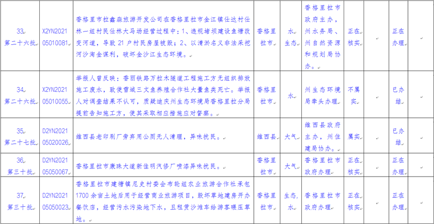 截至2021年5月7日上午,云南省迎接中央生态环境保护督察工作领导小组边督边改组交办中央第八生态环境保护督察组(以下简称“督察组”)涉及迪庆州群众举报投诉生态环境问题共37件(来电14件、来信23件),涉及香格里拉市22件、德钦县1件、维西县7件、州级部门7件。