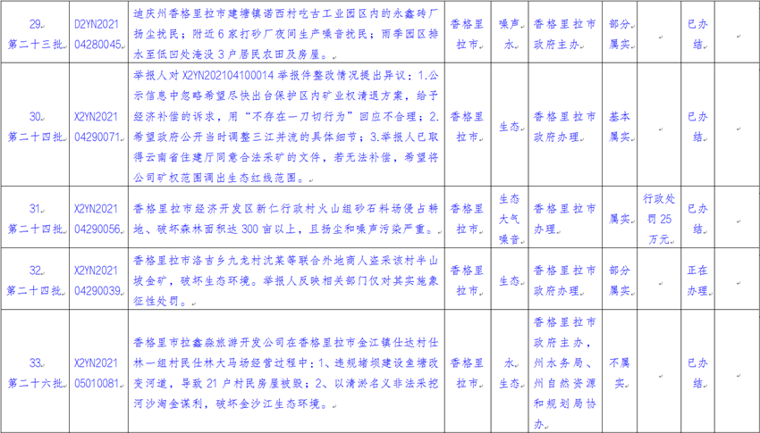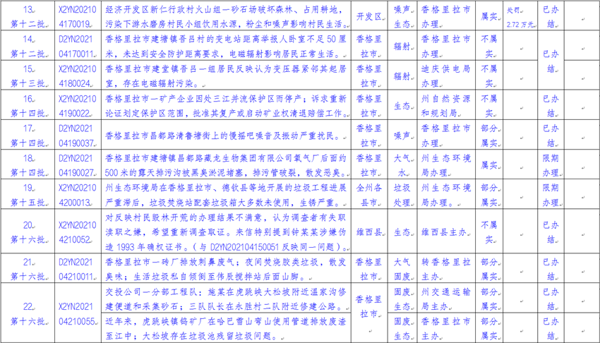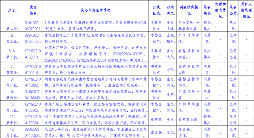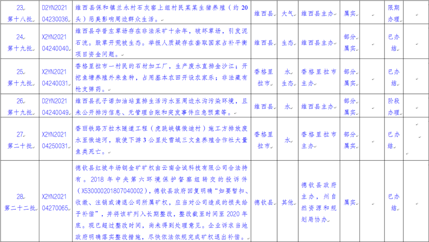 截至2021年5月11日上午,云南省迎接中央生态环境保护督察工作领导小组边督边改组交办中央第八生态环境保护督察组(以下简称“督察组”)涉及迪庆州群众举报投诉生态环境问题共38件(来电14件、来信24件),涉及香格里拉市22件、德钦县2件、维西县7件、州级部门7件。