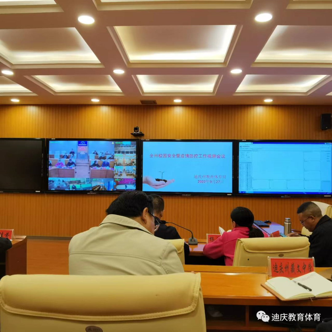 2022年9月27日19:00,在迪庆州青少年活动中心三楼会议室召开了全州校园安全暨疫情防控工作视频会议。会议由州人民政府副秘书长林维平主持,州人民政府副州长余桂芬、州疫情防控指挥部、州卫健委、州公安局领导,州教体局班子成员和相关科室负责人在主会场参加会议。县市和各级各类学校设视频分会场,县市分会场参照主会场参加会议。各级各类学校校园长、班子成员及相关负责人在校园分会场参加会议。