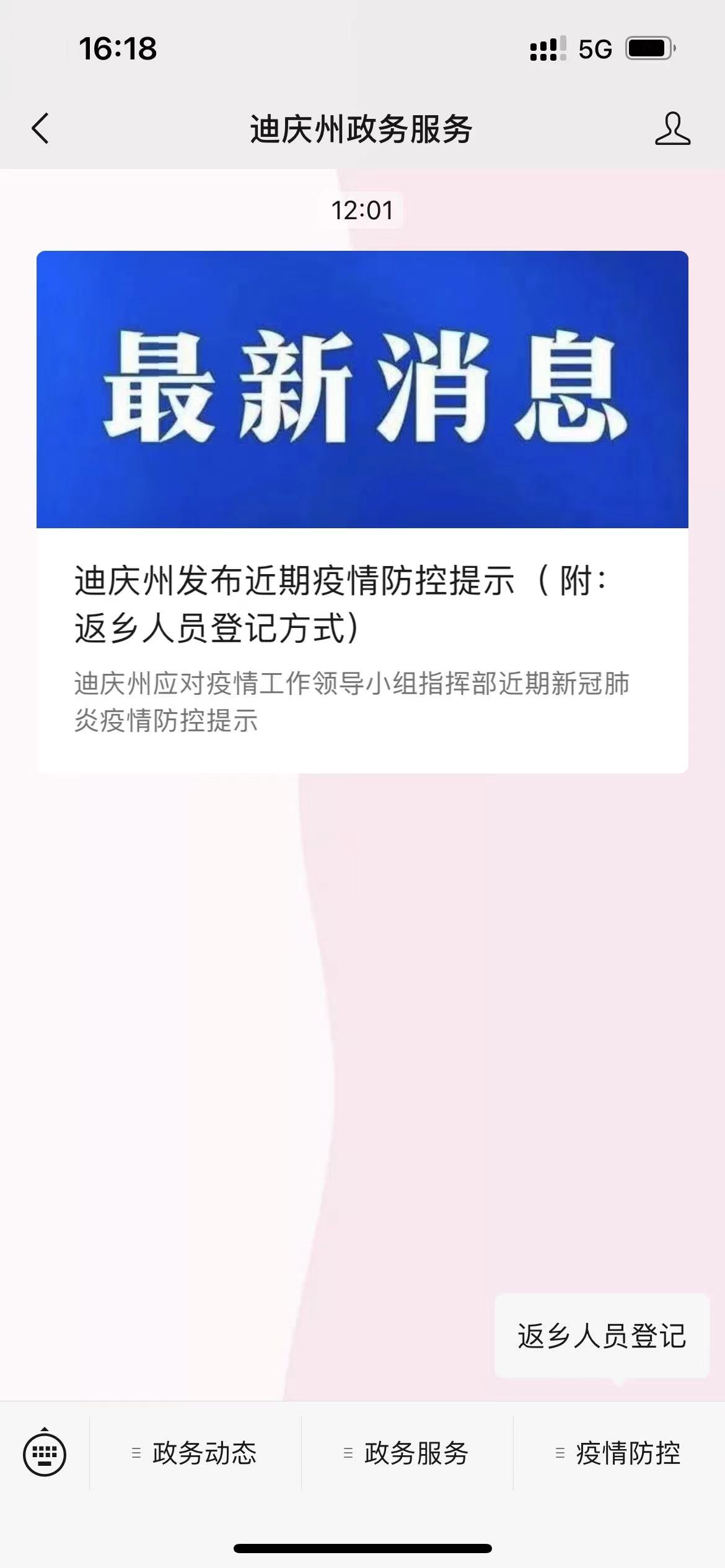 公众号设有“政务动态”和“政务服务”模块,供群众实时了解政务服务动态和办理部分事项,增加群众诉求反馈渠道,提高政务服务水平,切实做到为民办事。受州疫情防控指挥部的委托,公众号特增加了“疫情防控”模块,入迪群众可以通过返乡人员登记功能进行上报行程、疫苗接种情况等信息;该功能还设有“家庭组”选项,中老人或儿童等没有智能手机的特殊人群,可以委托其他人通过该选项代为填报;相关工作人员对于群众上报的信息可实现精准获取,能大幅度降低人员接触带来的疫情传播风险,提高基层网格人员返乡登记的工作效率,助力疫情防控。