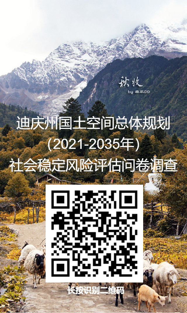 《迪庆州国土空间总体规划(2021-2035年)社会稳定风险评估项目由迪庆州自然资源和规划局组织规划编制团队开展,为保证公众知情权,广泛听取和收集项目相关利益群体意见,项目相关个人、群体、企事业单位对本项目有任何问题、意见和建议,包括(但不限于)规划对当地经济与社会发展的影响;规划对当地环境、交通、用地、安全等方面的影响;规划对当地居民生产、生活及其他方面的影响;事项决策影响社会稳定的因素;其他方面的意见和诉求等。可以在公示期间内将意见和建议通过电子邮件、电话等方式向本项目责任单位反应,也可以微信扫以下二维码填写问卷反馈。